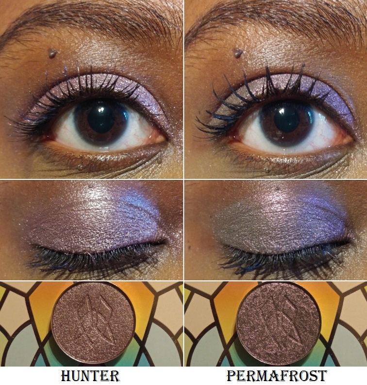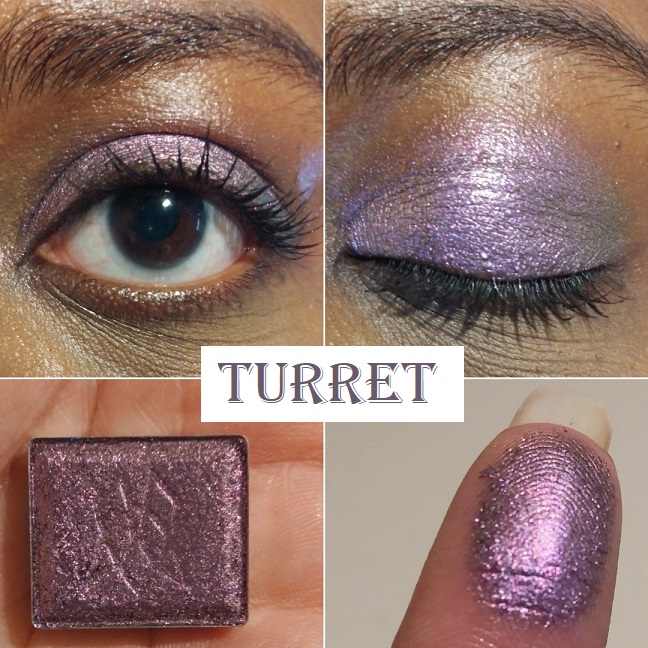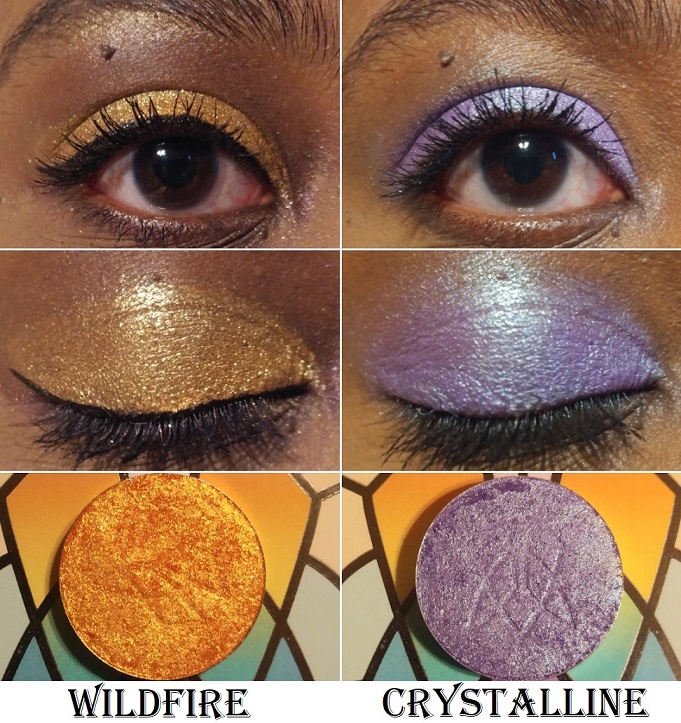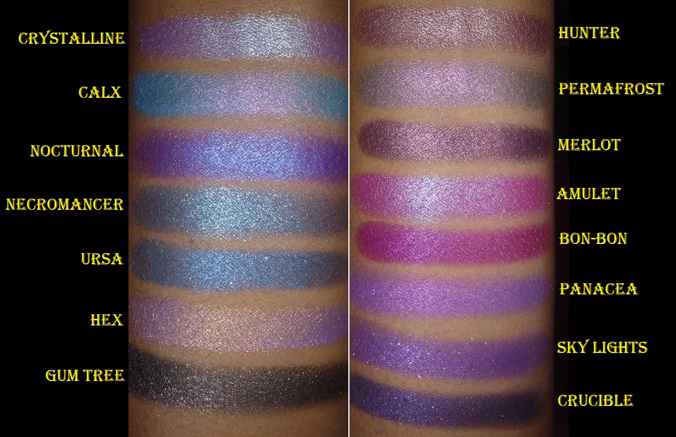 Hex – from the Dreamweaver collection and Team Witchcraft. It’s a beautiful, “mid-toned purple base with a gold reflect.” Hex is lighter and cooler toned than I expected based on swatch photos I saw around social media. It’s not my favorite on me, but the color in the pan is true to what you get on the eyelid.
