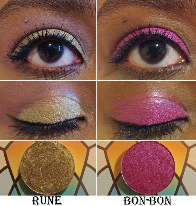 Bon-Bon – from the Dreamweaver Collection. This is a stunning color that’s as vibrant on the lids as it is in the pan! Clionadh describes this shade as, “a rich berry metallic with a cool purple reflect,” which surprised me because the base color is so intense that I didn’t notice the reflect on the eyes. The shimmer is so fine that the particles are undetectable, but it’s visible when the light hits it.