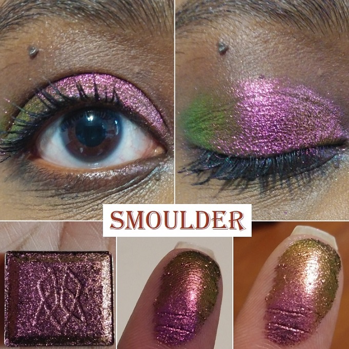 Smoulder “shifts magenta-orange-gold-lime.” The magenta dominates this shade. I found it interesting that I could see the lime and orange on my eye, but I couldn’t capture the lime shade on my finger. The magenta, orange, and gold are very easy to see. It reminds me of Pat Mcgrath’s Sextraterrestrial shade, but replacing the magenta with pink. I’ve heard Forge is a closer dupe to Sextraterrestrial, which is why I didn’t buy Forge. Devinah’s Australis shade is very close to this.