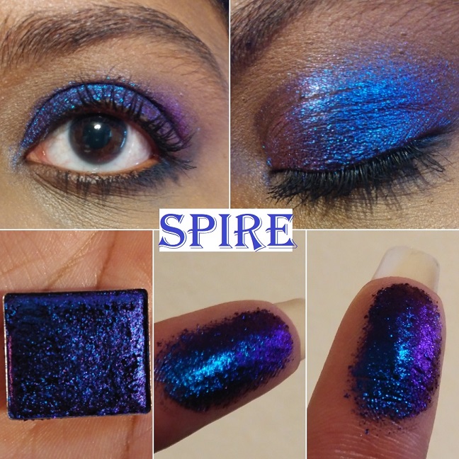 Spire “shifts royal blue-violet-red-orange.” This is actually the first Jewelled multichrome I purchased from Clionadh. Although the purple and blue are so close as to make the shift harder to see, I could still see the potential this collection had. I figured if I was pleased with this less obvious shifting shade, I would definitely love the others. This is great for dark dramatic looks, which I don’t do often, but it’s nice to have it available to me.