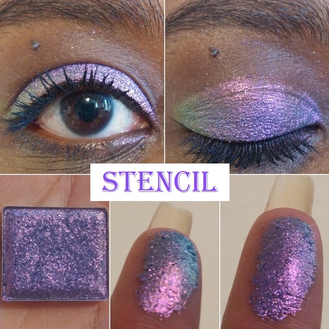 Stencil “has a semi-pigmented deep blue base with medium glitter particles that shift violet-pink-orange-gold.” I have purple-pink eyeshadows but nothing with this exact tone. Wow! It is so beautiful. If you’re a purple lover, this is an absolute must-have!