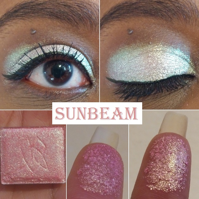 Sunbeam “has a sheer pink base with small/medium glitter particles that shift pale gold-lime-turquoise.” I have a few pink shadows with gold shimmer in my collection that I think are actually quite pretty: Pinkleberry from Coloured Raine, Meadowhawk and Golden Rose from Sydney Grace, and Empress from Devinah. This shade is more like Devinah’s Pixy Stix Xploder where it looks pink on my finger and in swatches, but on my dark eyelids, it looks incredibly light in a way I couldn’t have predicted. I have an easier time seeing the gold lime and turquoise at night when the lighting is different.