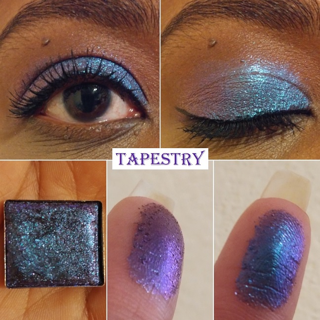 Tapestry “has a grey base with small glitter particles that shift blue-indigo-violet.” Like Medieval, I only like how this looks when applied wet and on a sticky base. It’s a pretty shadow, especially if you like blues with a tinge of purple, as opposed to purples with a tinge of blue. I am admittedly the latter.