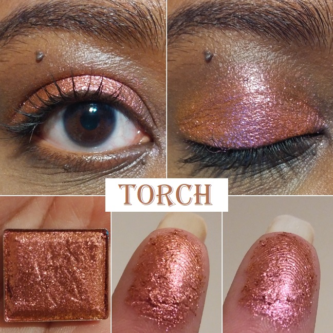 Torch has “a pigmented copper base with medium glitter particles that shift red-orange-gold.” This is very pretty but very hard to see a shift with indoor lighting. While outdoors, it was very easy to see orange and gold. This shade is like a toned-down version of Kiln.
