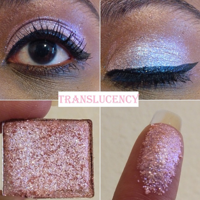 Translucency “has a sheer baby pink base with small glitter particles that shift blue-indigo-violet-pink, and tiny gold sparkles.” The way it looks in the daytime isn’t my kind of color, but how it looks at night is beautiful to me. It’s the kind of shade I prefer to use as a topper and not as a one-and-done eyeshadow.