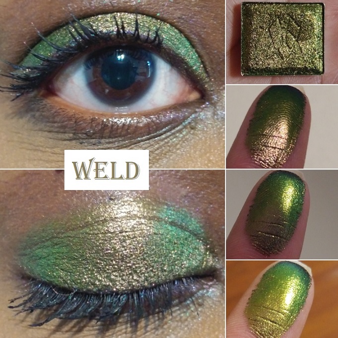Weld “shifts grungy rose pink-antique gold-lime-teal-navy.” I bought this shadow specifically as a more neutral-leaning shade. I thought it would be cool to have that antique gold, which would look like a brown and blend in with my skin, which could also shift in different lighting to show an intense lime. When I wore this, I could see a little pink mixing in with the antique gold in the center of my lid, which again gave me Sextraterrestrial vibes, but it wasn’t strong enough for me to capture in the pictures.
