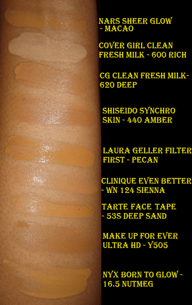 Tarte Face Tape in 53S Deep Sand 54G Deep Golden – I had help from an Ulta associate getting shade-matched to Deep Sand, which tends to be my closest match in Tarte’s foundations. I really loved the finish and coverage. I still felt like the tone was slightly off, but there wasn’t anything better suited for me in the range. So, I wore this a few times and went back to my other foundations.