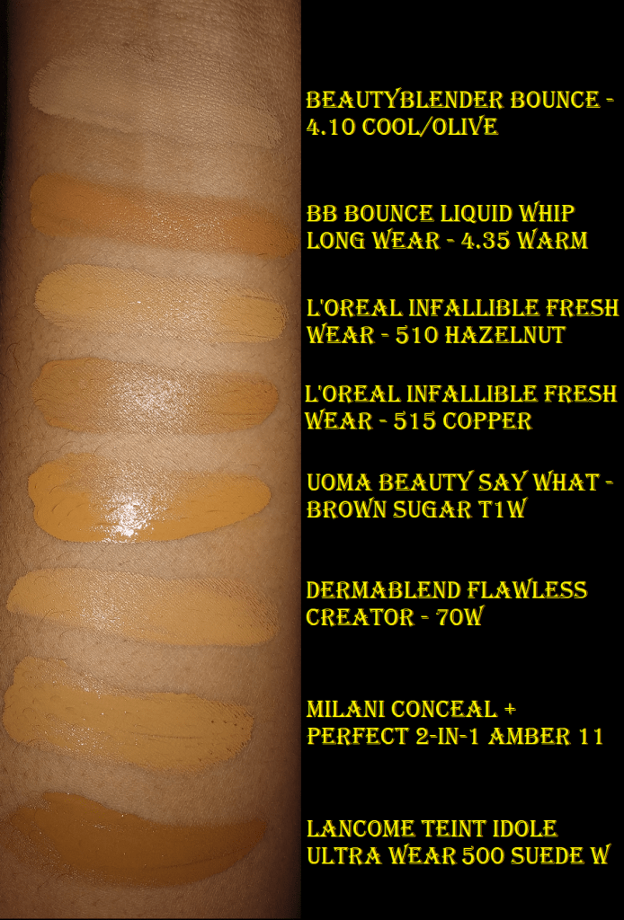 Dermablend Flawless Creator Lightweight Foundation in 70W – This foundation has the closest consistency to the Uoma Beauty one, however, it doesn’t give the same finish and doesn’t have quite the same texture. It also looks light in the swatches above but when it fully dries, the color darkens to a very close skin tone match for me. Although I can use this all over my face, my favorite use for this is as a lightweight but full coverage concealer with a natural/semi-matte finish. I got the idea from Marlena Stell, Makeup Geek founder, who frequently uses this foundation as a concealer in her live makeup videos on Youtube. Once I bought the Pat Mcgrath concealers, I stopped using this for a few months, but now I’m using it again to cover my dark circles and hyperpigmentation. A little goes a very long way and if the tiniest amount isn’t used, it can look almost mask-like. They weren’t kidding about this being full coverage, which is why I prefer to use this as a spot concealer. 1-4 drops can be mixed with moisturizers, serums, sunscreen, etc to create a sheerer complexion product but I haven’t done that yet. I like the formula as is.