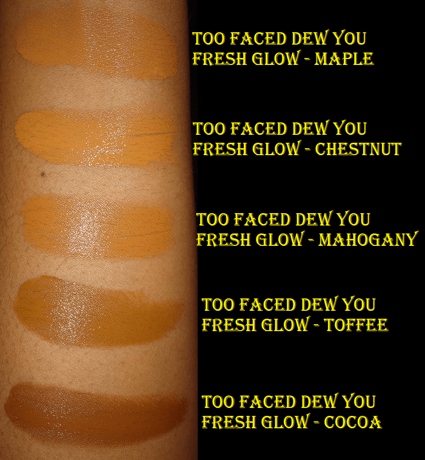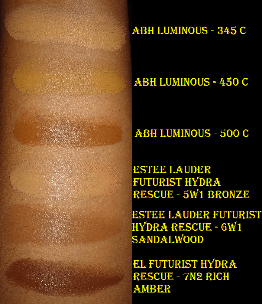 Now we’ve reached the section that are purely foundation sample card swatches. The only points I can make about these is that the Too Faced Dew You Fresh Glow Foundation has fragrance in it. None of those ABH foundations match me, and I was surprised by how dark the Estee Lauder 6W1 Sandalwood shade looked on my arm. A few years ago I used to wear that shade in the Double Wear formula.
