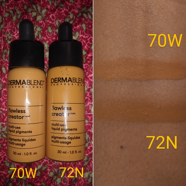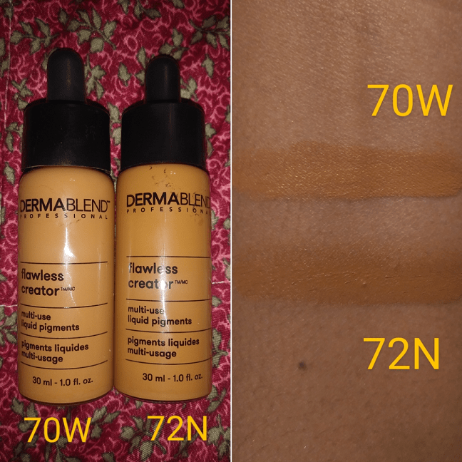 I think it may be time for me to toss my bottle of 70W, due to some perceived changes, but I’m not ready to let it go yet. Ulta had this for 50% off a week ago, but they don’t carry 70W. I still bought 72N hoping it could work for me, and it does as an under eye concealer, but being slightly darker and slightly more orange is enough to be mismatched for the rest of my face unless I use one of my light yellow setting powders (such as the Laura Mercier Honey shade) to balance it out. However, it looks too drying if I set it with powder. Unlike other complexion products I own which aren’t intended to be mixed, the Dermablend drops are a multi-use product. I’ve only had 72N for a few days, so I will experiment with it some more to find out the best way to utilize this shade in the future.