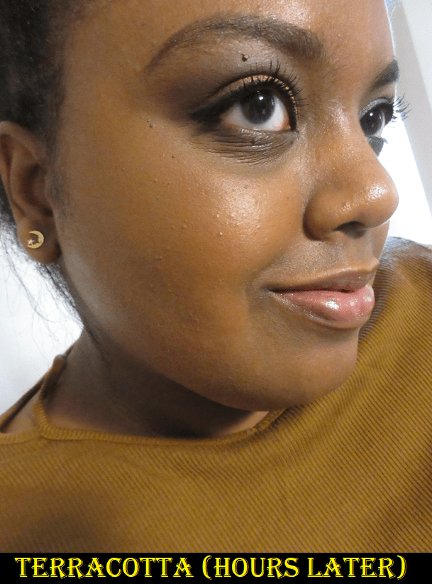 The last point I wanted to make is that I’ve tried to use Terracotta many times on my cheeks (and it actually makes a decent under eye setting powder). There was one time that I had it on and a slight tinge of color actually showed on my cheek by the end of the night. I don’t remember what foundation I was using at the time, but it led me to believe that if this shade is applied on foundation that oxidizes or will allow my natural oils to come through, it could potentially show on my skin. I have since tried to recreate that same scenario and have been unable to get the color to show visibly enough on camera (hence the hours later photo in the gallery above). So, I still stand with the fact that this won’t work on someone with my same skin tone. In the best case scenario situation it’s barely a whisper of color.