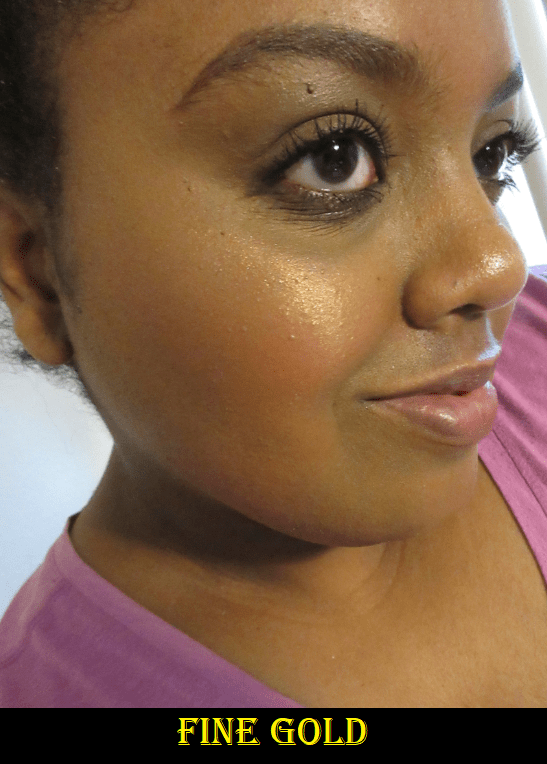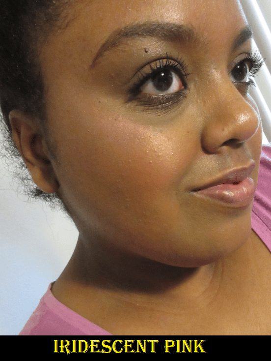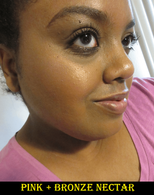 Bronze Nectar on its own is is a traditional highlighter shade, but that doesn’t make it boring. It’s still a very pretty color. I thought I would like Fine Gold 003 more than Iridescent Pink, but the strong yellow shift doesn’t look as great on my skin as I had hoped. It’s still fairly nice, but just my least favorite of the three.