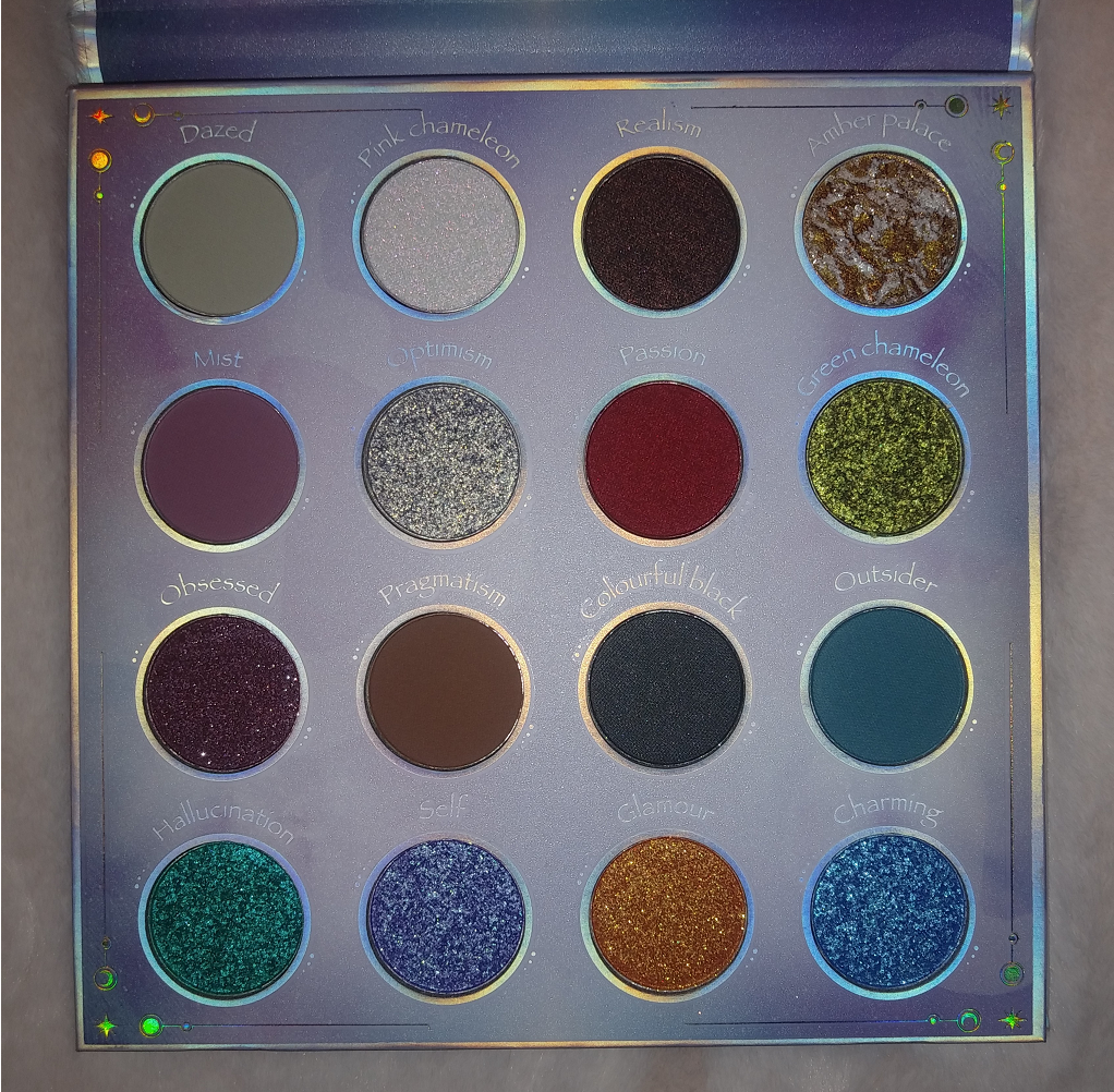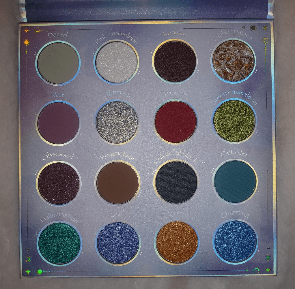 There are five other diamond shimmers listed in this palette. In fact, all the sparkly-glittery shadows in this palette are referred to as diamond shimmers. The first is Optimism, which looks similar in swatches to Amber Palace except the base color is purple. It’s another shade I consider a topper because the base is so sheer. I prefer to use this shade with cooler toned looks and Amber Palace for warmer ones. Next is Hallucination, a blue-green shade that’s like a medium toned turquoise with pink and purple shimmer. The texture of this shade is wetter than the others and doesn’t feel as well bound to the sparkles as the others. It feels like it was intended to be a shimmer version of a cream to powder formula. It leaves a residue behind on the finger, the way cream products do, and takes a bit of smoothing to give it less of a chunky appearance. The color is beautiful but I’m not a fan of this particular formula. It reminds me of the texture my homemade eyeshadows feel like when I use slightly too much liquid binder. Self is a stunning purple with teal, silver, and perhaps green sparkles. It’s very much my kind of eyeshadow shade. Glamour is an orange and gold shadow that reminds me of the pressed glitter shade I wanted from the Juvia’s Place Nubian Glow palette (but depotted and thew away). I’m so glad to have this version as a regular non-pressed-glitter shadow! The eyeshadow palettes from Oden’s Eye’s previous collections had some pressed glitters in them but there are none in the Norn’s Collection.