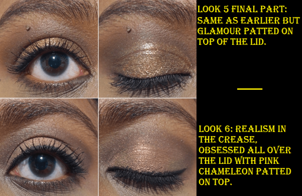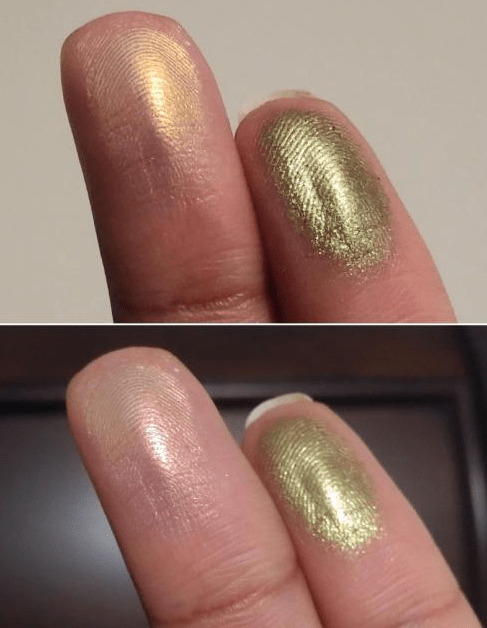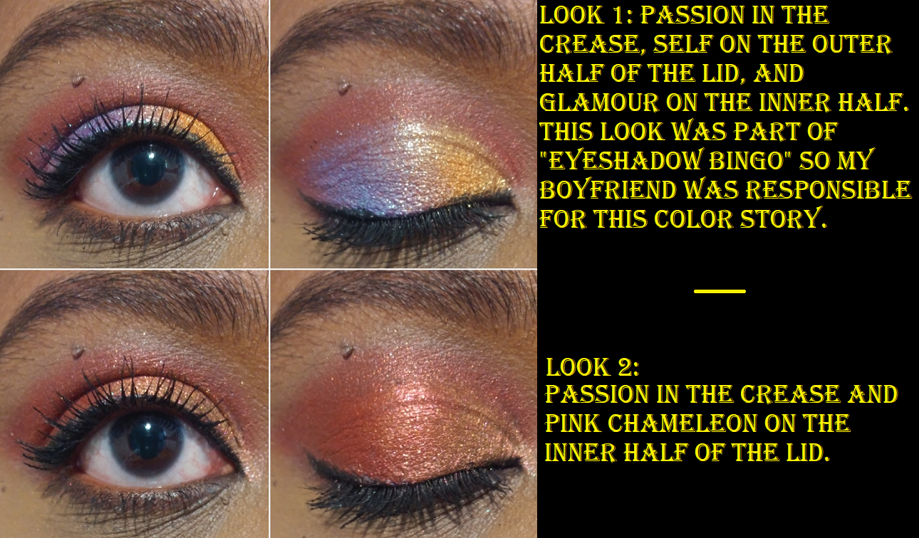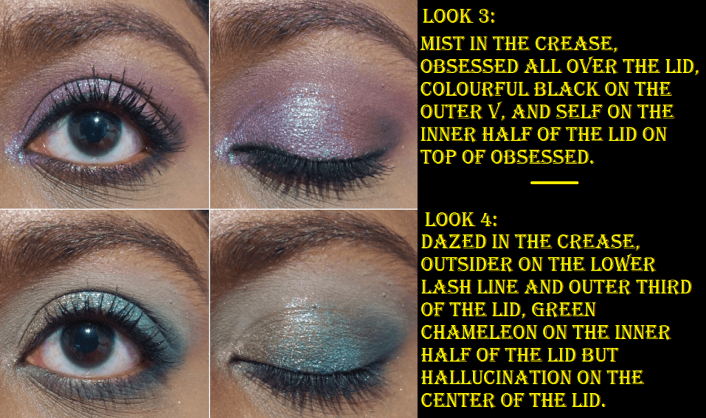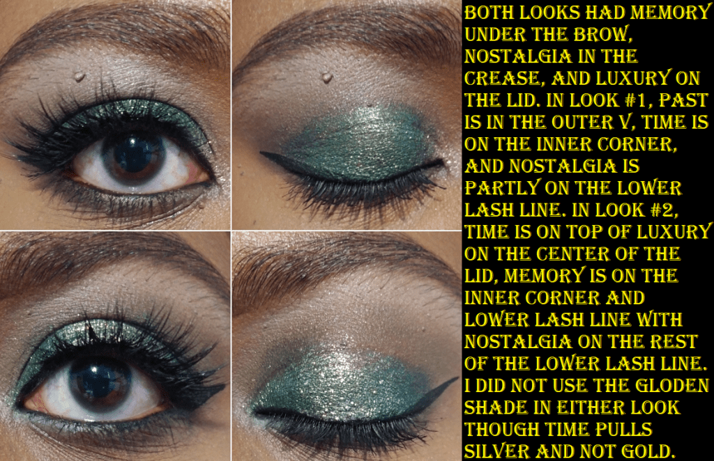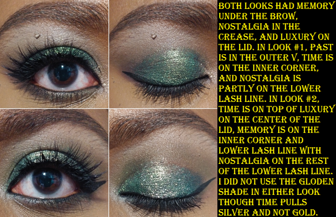 This has the same great shadow quality as the Norn’s palette and it was so easy to create a look. I used the same shades for both of the eyes, but the change in technique and color placement made them look surprisingly more different than I expected! The Luxury shade on the lid is gorgeous! It’s mostly green with yellow gold reflects of diamond shimmer. Luxury has a black base which I noticed darkened the crease shade on the eye that I used the MAC Foundation Stick as a primer (look #2). In Look #1, I used a MAC Paint Pot and this did not happen. I also used the Nyx Glitter Primer on both lids.