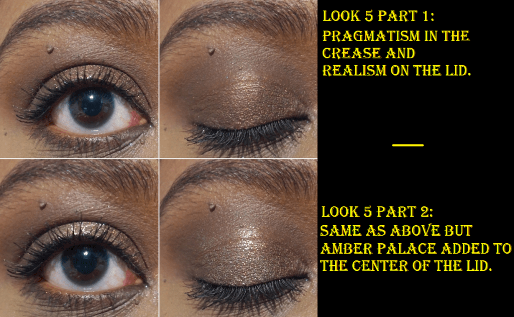There are two easily recognizable satin shades in this palette, or as Oden’s eye says, “metallic eyeshadows that look like satin.” Metallic shades are different from my perspective, so I’ll just refer to them as satins. One is Realism, a gorgeous medium-dark brown. Realism has visible copper reflects, but I prefer to have more of a contrast in my eyeshadow looks. I don’t mind doing a neutral eye from time to time, but if I’m going neutral I want a bit more sparkle. So, what I love to do is combine this shade with pretty much any of the more sparkly shades in this palette. There are so many options to choose from that are so pretty. The outcomes are different enough that I wanted to demonstrate several of them.