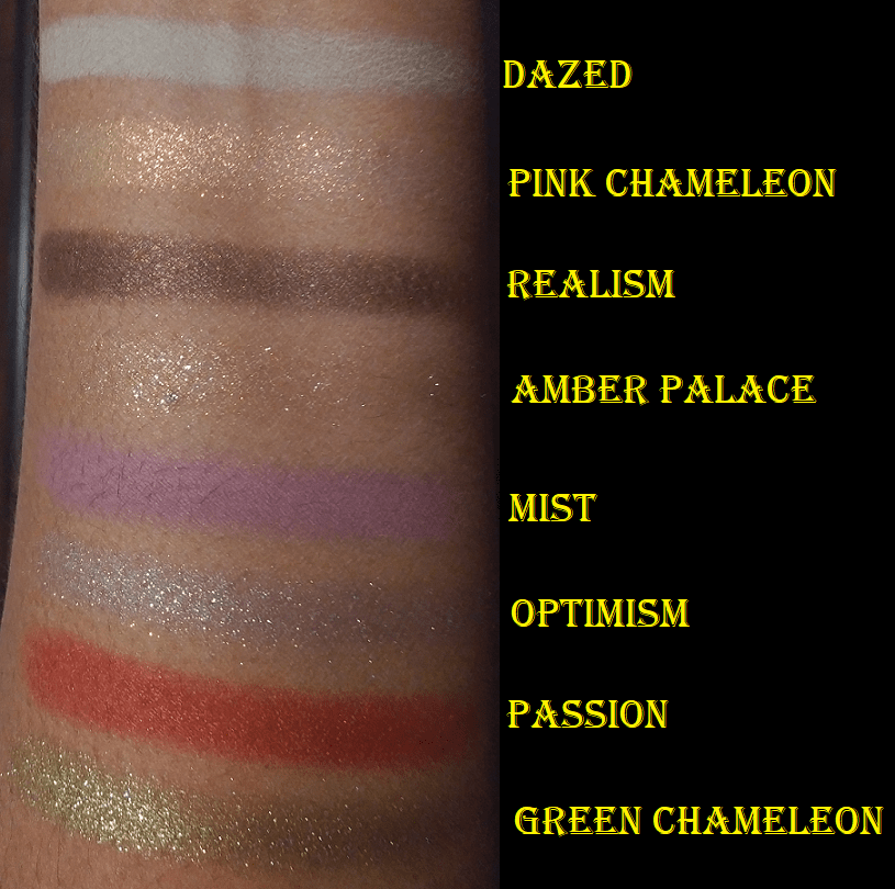 There’s another shade called Green Chameleon in this palette. The website has this listed as an, “Olive green chameleon eyeshadow, multichrome shift,” without describing what what the other colors are. Honestly, I don’t see any shift. The texture of Pink Chameleon is that slick recognizable multichrome texture like Clionadh’s Jewelled formula, Devinah’s Aurorae Flares, the shade called Fake from the Juvia’s Place Wahala 2 palette, etc. Green Chameleon feels like the other four diamond shimmers in the bottom row of the Norn’s palette. The two best ways I’ve been able to detect multichromes is to swatch them on the palm of my hand and rotate my hand around, or to apply them to my fingers and hold them vertically and raise my fingers up and down so that it moves closer then further from the light. All I can see is it going from an olive green to a slightly lighter olive green or a greenish yellow. Its not a difference anyone will notice if you put this on your eyes. It’s still a pretty shade, but I don’t count it as a multichrome or duochrome.