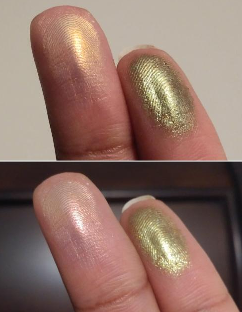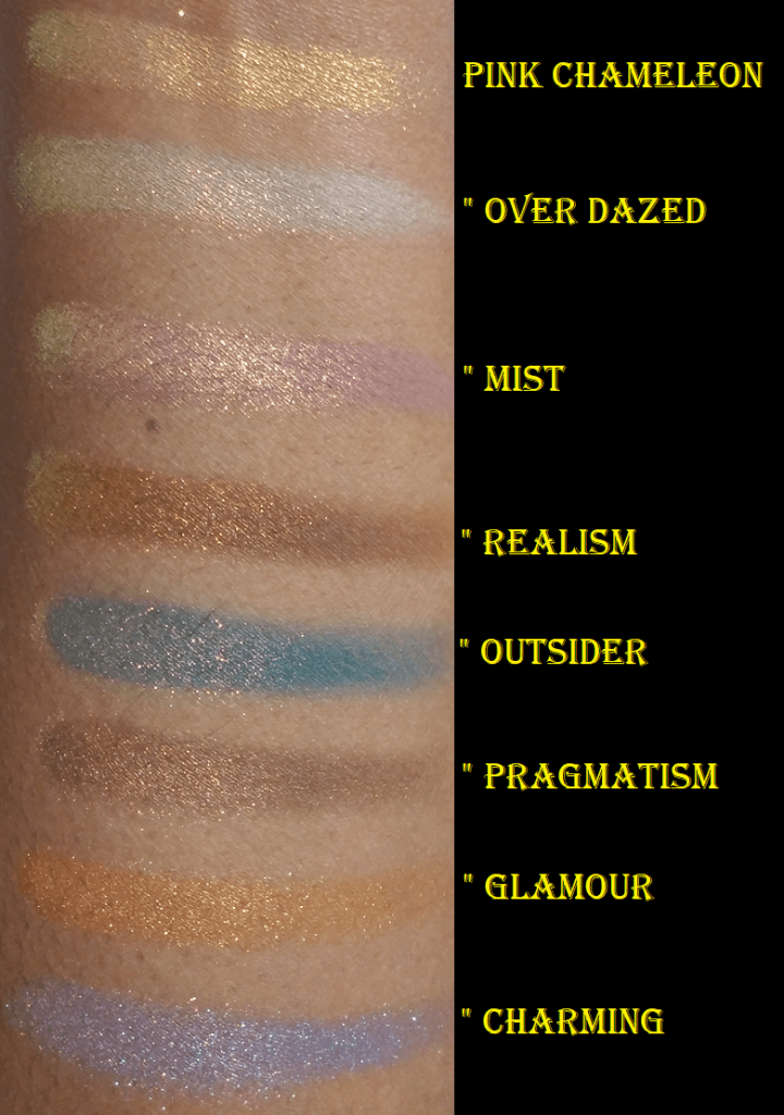 Pink Chameleon is a multichrome! The brand only describes this as having a pink, yellow, and green shift, but I swear it also looks a bit more orange or red or peachy depending on the light and angle. On my finger, this multichrome had clear and obvious shifts. On my eye, this color looked very different depending on which shades I put it next to or on top of. For instance, sometimes it would only pull peachy-pink or yellow-gold, or yellow-pink. In rare occasions I could see pink-green. The green element being the least visible on my skin and especially on camera. I had to do a lot of experimenting with Pink Chameleon to figure out which combos would give me the effect I wanted.