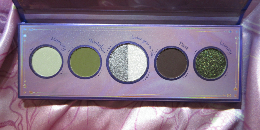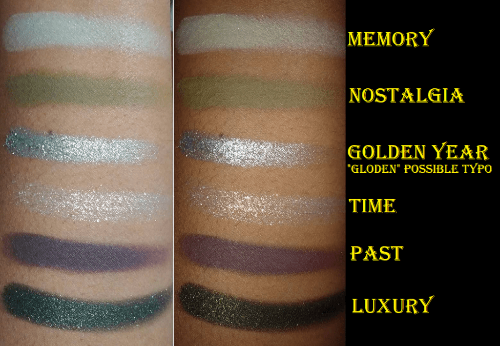Gloden Year & Time are the split pan shadows. I believe ‘gloden’ was a printing error because the website description says, “Golden year: Silver metallic color, the golden year is just a silver memory in the past” and “Time: Colorful shift of multiple colors against a semi-transparent base.” Golden Year is much smoother and the shimmer particles are much closer together than the shade Time. Time is a chunky flaky topper formula that I can clearly see as gold toned in person, but my camera only picks up a silvery hue.