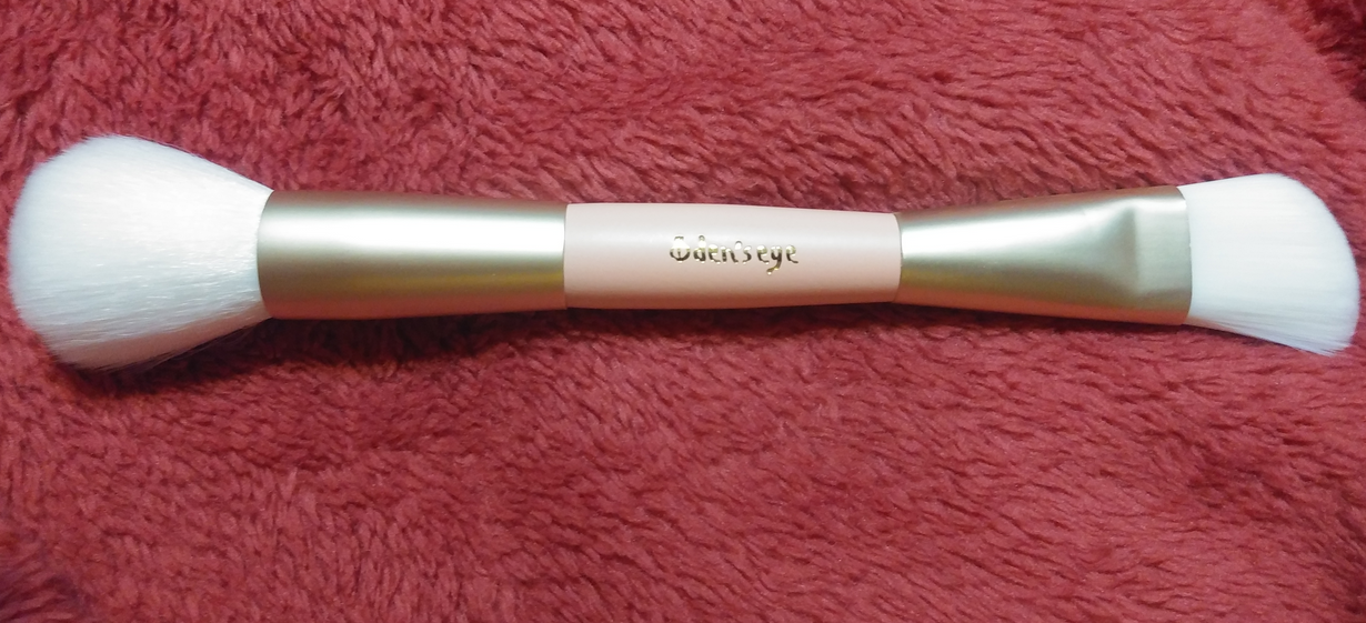 This brush is made of synthetic bristles. The fluffier end is very floppy and loosely packed, but it makes a fairly nice blush brush. The stiffer and tighter packed end is slightly angled. I can use it on its widest side to brush the highlighter in small sections of my cheekbone. With this one, the bristles can rub harshly when I do that. A smooth and soft application occurs when I turn the brush to the side and use one long sweep with the tips of the bristles to spread highlighter across my cheekbones. I don’t foresee myself continuing to use the stiff side, but I will probably use the soft side for blush every now and then.