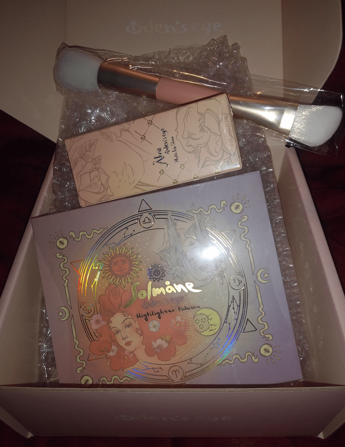 Oden’s Eye released a small (25 euro) and large (55 euro) mystery box in celebration of Easter and the company’s anniversary. Affiliate/Influencer codes worked on the deal, so I was able to get my small box for 22.50 euros with free shipping. The Norn’s collection was excluded, but nearly everything else was a possibility. I anticipated I would get a palette, lip product, and brush. I only hoped the shades would work for me and that I would not get a product I already own, so I was happy that all expectations were met. The brush that came with my order will be discussed in the brush section.