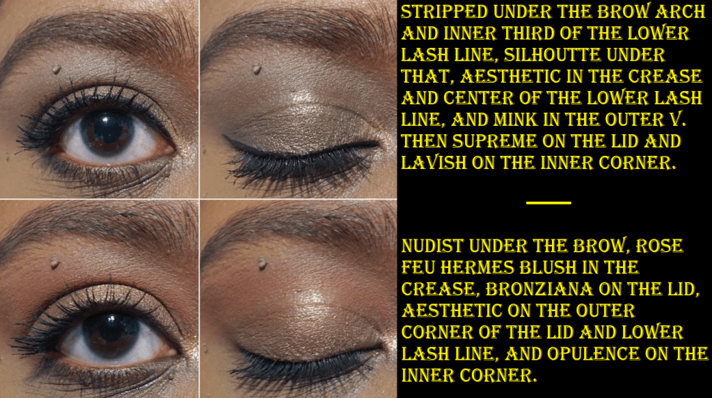 When it comes to the two deepest shades, Aesthetic slightly darkens the outer corner but isn’t deep enough to give me any real depth. For that purpose, I can only rely on Minx, but it makes all my eye looks a lot cooler-toned when I use it. I expected Aesthetic to be much warmer but it only stays warm if I use it on bare skin. If I use it over a base (whether a traditional eyeshadow primer or foundation/concealer), it deepens to a neutral toned brown, even if the base has fully dried down and even if it has been powder set as well.
