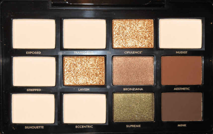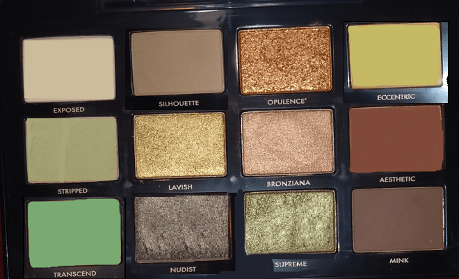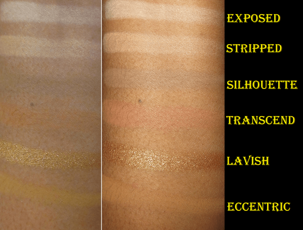 The edited photo above represents how I expected this palette to work for me: repeat brow bone shades, repeat golds, a warm brown shimmer, antique olive green shimmer, a warm deepening shade, and a cool deepening shade. I wish I could say it turned out to be more diverse than I predicted, but it did not. While I can see the differences in tone among the six shades I marked above as being brow highlighting shades, it’s not enough to make a significant difference. Exposed and Stripped look cooler or warmer depending on what eye base I use; their own tones don’t matter. I’m glad that they at least are not stark or ashy on me like some light shades are. Nudist, Transcend, and Eccentric all blend into my skin and look like my natural skin tone, regardless of the color of the eyeshadow base. Silhouette looks like my natural skin color as well, but a cool tone version.