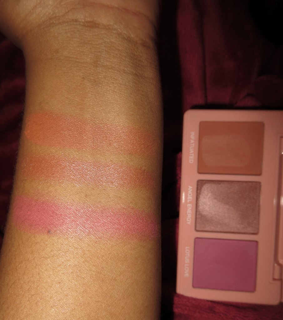 I was surprised how pretty I thought Lotus Love was, considering I typically don’t go for berry blushes, but this isn’t a deep berry. Perhaps that makes a difference. I find it fascinating that oranges and berries, shades touted as being best for deep skin tones, are present in this blush palette, but in ways that make them more interesting and different from what is common on the market. These blend well into the skin, but they aren’t the longest lasting. They fade a bit quickly on my cheeks at around the six hour mark, and also when I’ve use them as eyeshadows. I don’t mind that as much, but it’s important to note. Also, the satins have an extreme amount of kickup! I haven’t seen kickup on a blush like this since reviewing the Milani Baked Blushes!