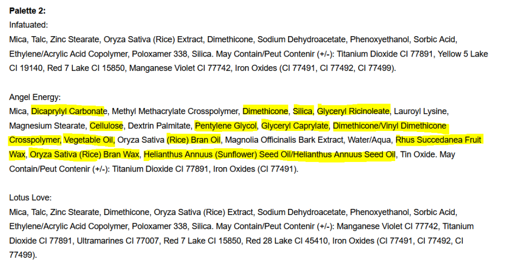 I’ve highlighted the ingredients that to my knowledge are emollient/slip/moisturizing ingredients in Angel Energy. I may have missed some or mismarked some as I am not a cosmetic chemist. As a makeup enthusiast, I did my best research.