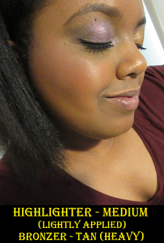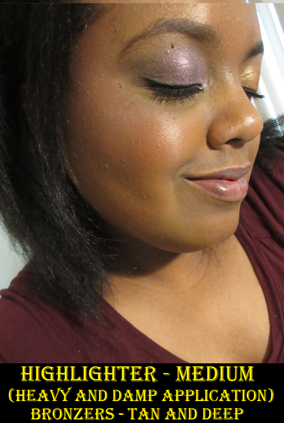 The photos in the black shirt were taken during the trip. LED lights were far above with a small amount of outdoor light shining through a window onto my face. I am wearing the Tan bronzer built up heavily and the highlighter on the high points of my forehead, above the brow, in the brow arch, on the center of the eyelid, lightly on the nose, and on the tops of my cheekbones.