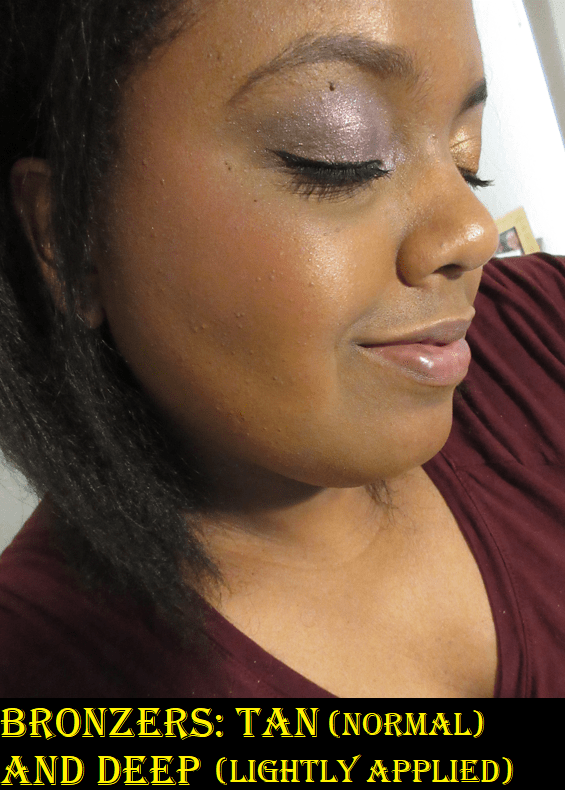 I find it fascinating that the Tan bronzer looks so warm on lighter skin tones, but on my skin it’s more of a neutral shade. When I was taking product photos, I could see that without flash, the bronzers looked much cooler toned in their pans than with flash on. I’ve included multiple photos throughout this post which demonstrates the differences I observed.