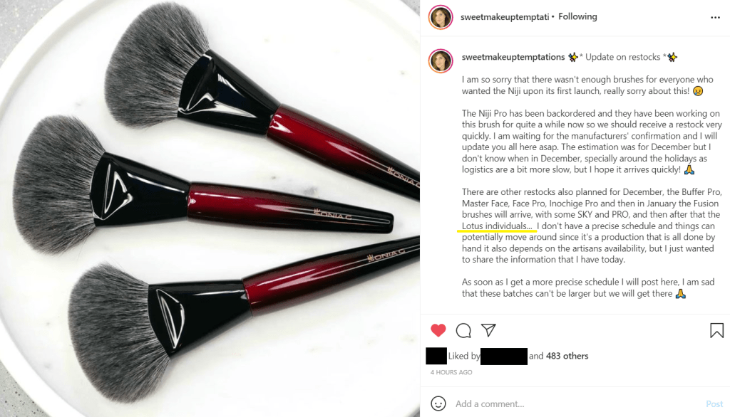 I had to get creative in order to have the brushes I wanted from this series. It was stated repeatedly by Sonia herself that the Lotus series would only be available as a full set. I couldn’t afford that expensive of a purchase, so I sold the brushes I didn’t think I would get as much use from in order to help pay for the brushes I was keeping. However, I can’t say I was shocked by the switch from the initial, “It’s not possible to sell this individually,” statement on Sonia’s blog on July 11th to the, “I’ll have to see if we can,” on August 20th on her Instagram.