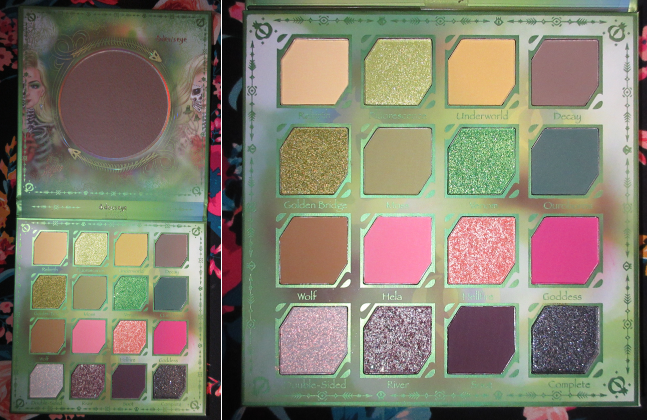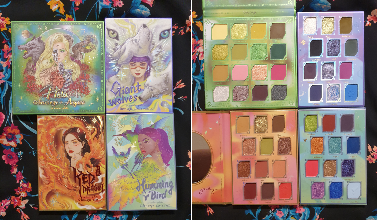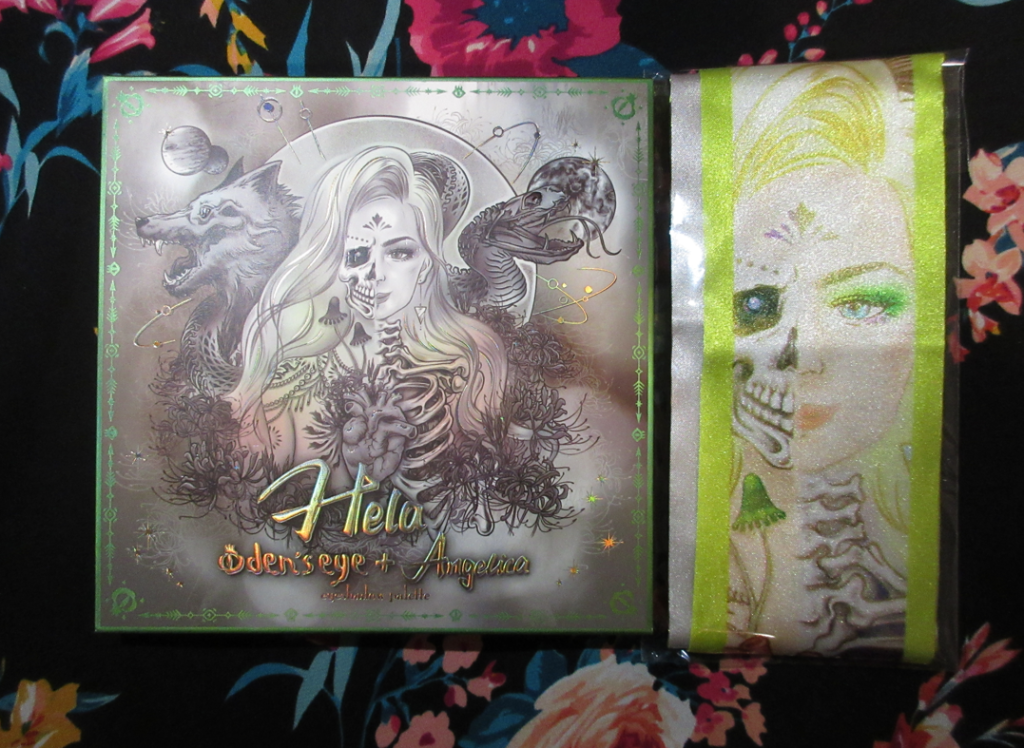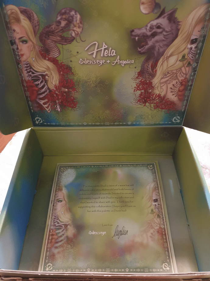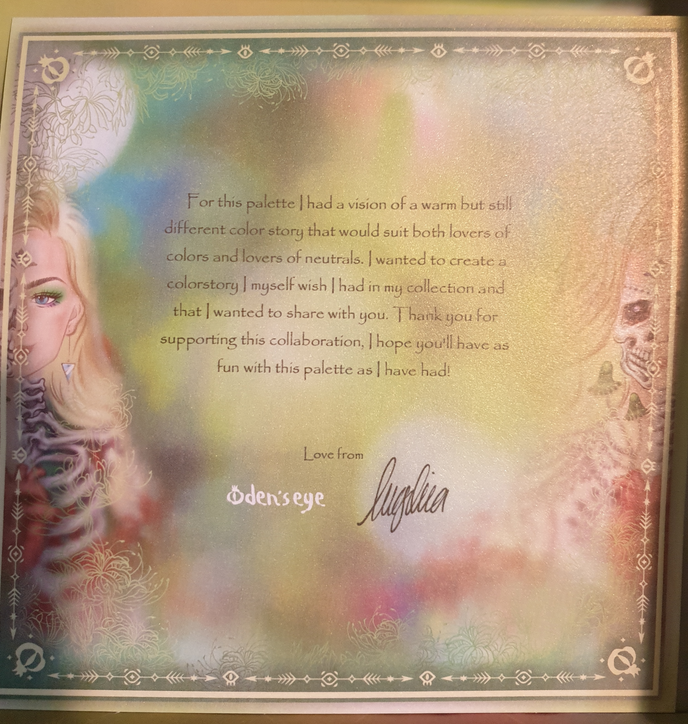 The collaboration palette between Angelica Nyqvist and Oden’s Eye is the newest addition to the Legendary Diversa Collection. Just like the previous release, all orders from this collection come in a box with the palette artwork printed on the inside. The free scarf idea was tweaked for this launch in the form of a reversible ribbon/Twilly, while supplies lasted.