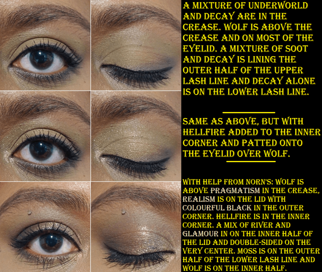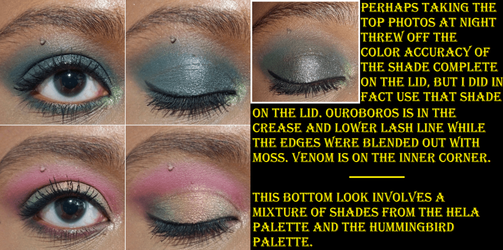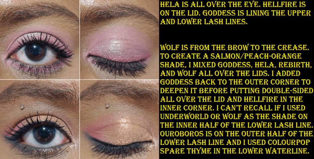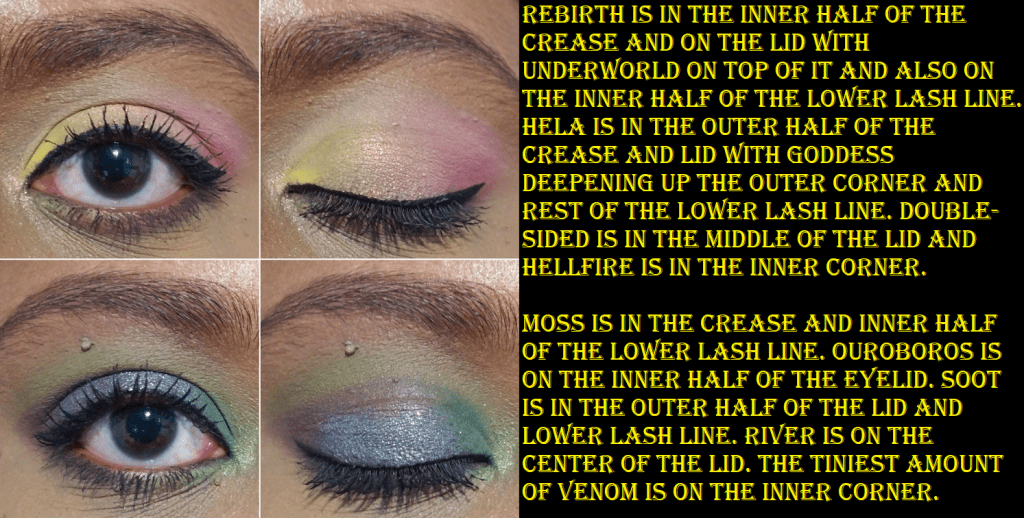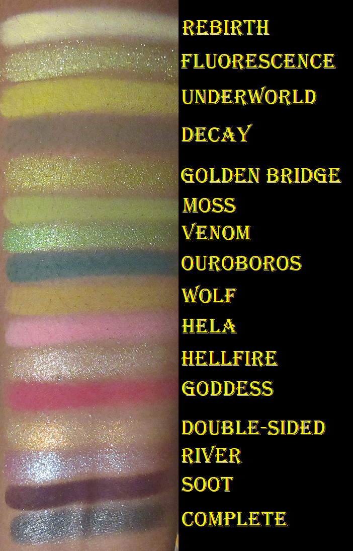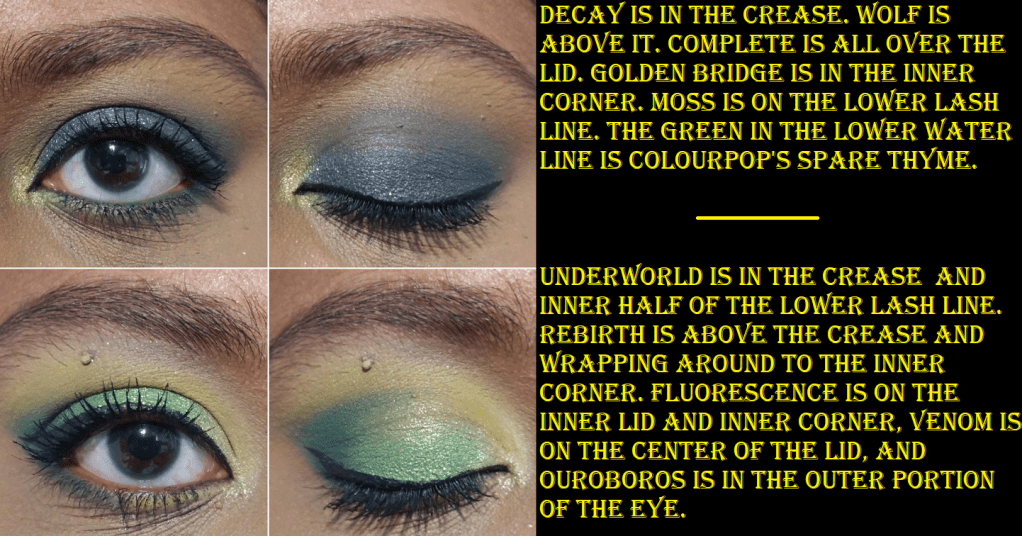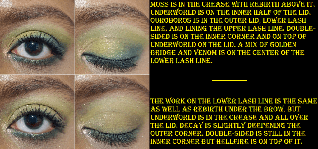 I don’t have the best luck with yellows, so I was shocked at how well these built up and lasted on my skin, especially Rebirth because using pastels on dark skin can often be unflattering. Rebirth isn’t the kind of shade I’d wear on its own, but it’s very complimentary to the other yellows and greens in this palette, so I’m surprised to say I like it! My two most frequently used mattes are Wolf as a transition shade and Ouroboros as a deepening shade for the yellow/greens/browns and as a colorful pop when used with the shadows in the bottom rows of the palette. Decay is intriguing because the first time I used it was on top of Wolf and that made the taupe/cool brown tone turn more of a dark grey color, which is not the kind of shade I like to wear. However, I noticed it should be deep enough to create depth for some lighter looks, so I decided to try it again. When Decay was applied on top of Underworld, that helped to bring more of the brown out of that shade. In Angelica’s launch video, she says she wanted a colorful palette that still had some neutral leaning options. I haven’t liked any of my attempts to get a neutral look out of this palette, so I always turn them into a more colorful look to salvage it. Perhaps this wouldn’t be the case for someone of a different complexion than me. This is not a complaint, as usually I have the reverse issue where partly neutral colorful shades (like reddish brown, grayish purple, etc) just look solidly neutral on me. So, it’s kind of refreshing, but also unfortunate that I’m going through a neutral loving phase at the moment. How ironic!