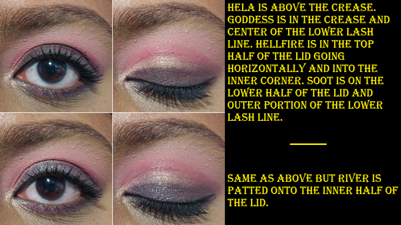 Hellfire and River are two topper-type of shadows in this palette. They both have bases, but those bases really don’t show through on their own and need to be applied on top of other shades to get the effect I’m looking for. For example, the gorgeous peachy look to Hellfire in the pan just looks like the palest pink, almost white eye shadow on me. So, I just use it now as an inner corner highlight shade. I also don’t get the purple tone out of River, as seen in the photo above in the pink/purple look where the only effect it had when patted on top of Hellfire and Soot was to darken them slightly and add some extra sparkle.