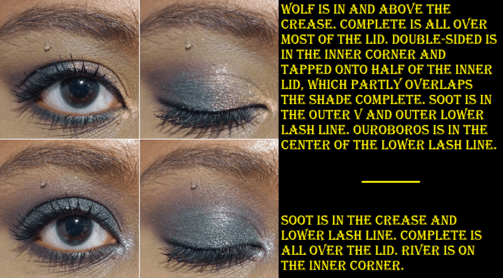 Complete is another fascinating shadow. In the photo above, I had to include a picture with flash on to show the black tones accurately when paired with Ouroboros. For some reason, those two together throw my camera off and make Complete look very teal. As seen in other eye looks with Complete, it still veers a bit blue, but is still very much a dark gunmetal-esque black. Oden’s Eye impressed me with the shade Colourful Black in the Norn’s Palette, and once again, they’ve impressed me with this one too. I keep wanting to use that shade in every eye look I do with this palette!