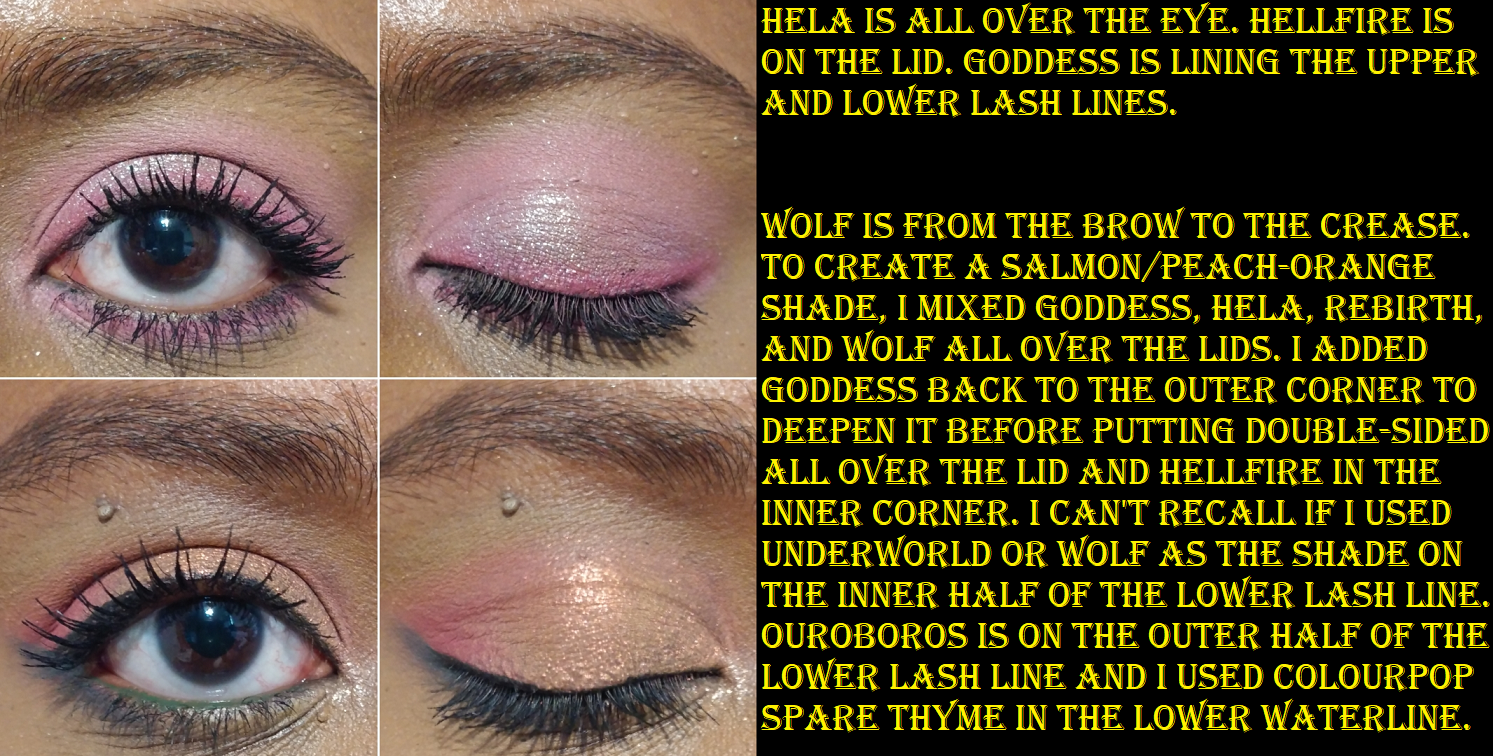 Double-Sided is like an orange-pink-green shifting shade, but the orange shift is strongest on my lids. It’s everything I wanted out of the shade Hellfire, but with the fun twist of being a multichrome. I discovered that if I mixed Goddess, Rebirth, and Wolf together, I could create a peachy-orange shade, which brings out more of the peach in Double-Sided when I apply that shadow on top of it. I add a bit of Hela too, just to soften up Goddess, but technically the color can be achieved without it.