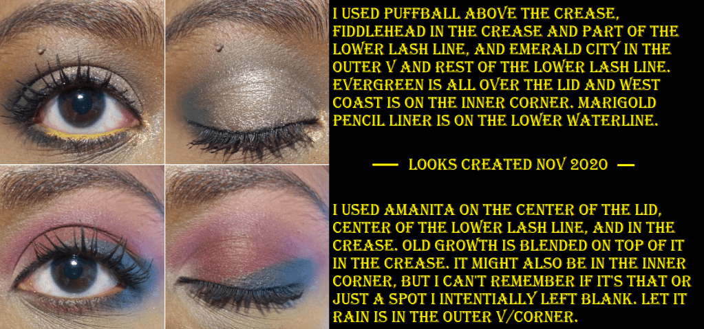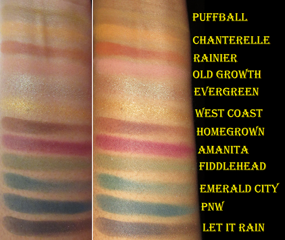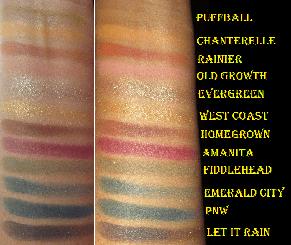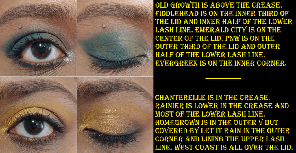 I only used this palette two or three times prior to reviewing it again now. This should be a color story I’m crazy for, but for some reason I don’t like how most of the shades look on my eyes and in combination with one another. The exceptions to this are Evergreen, Fiddlehead, and Homegrown. I love the shade Emerald City, but it’s a very patchy shadow. PNW at least fills the role. It’s blue, but leans closer to green than a standard blue shade. Other than my dislike of the tones, the patchiness of Emerald City, and the fact that Old Growth doesn’t show as pink on me, I think the other shades are okay despite them overall feeling dry and not the easiest to work with. I think this palette being a few years old by now is why the performance has declined from that first initial impression I had. It’s not bad, but it’s not as easy as my newer Colourpop palettes.