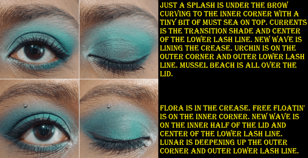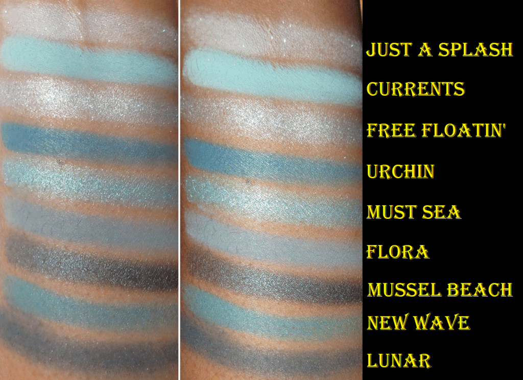 Other than the colors, the actual quality of these shadows is nice enough. The mattes are a bit on the thinner side, but I can understand wanting to do this since shadows this saturated can be harder to blend and patchy depending on the ratio of pigment/dyes. Two dips with my finger in the pan (as seen in the swatch photo) show how evenly I can spread the color, but also how they’re not as opaque because of how thin the powder is. The mattes have to be built up a little. As for the shimmer formula, there’s a bit more slip in these than usual. While this can help with spreading the shadows, it’s so much that I can accidentally pick the shimmer back off my eye and either onto my finger or move it to gather on a different spot. It basically can create sparser areas devoid of shimmer that I have to build up and smooth over. This doesn’t happen in a large enough area to be a nuisance, but it noticeably adds time when creating a look. This may seem like bad quality, but it’s just a matter of someone’s preference because some people really like that dimethicone feel to shadows or like a shadow that takes little effort to blend, even if it does mean having to build it up though. I’m able to create very pigmented looks, so I applaud Colourpop for that. However, I’m planning on only keeping Mussel Beach, Must Sea, and Lunar, so I can’t really recommend this palette on the basis of this not adding much to the Colourpop line. I do love that Mussel Beach is a bit different for Colourpop as a brown-teal duochrome shadow. It’s a teal version of Clionadh’s Vortex, but without much shine. That’s the one aspect that would have been better with the Mussel Beach shade if the shimmer particles were brighter.