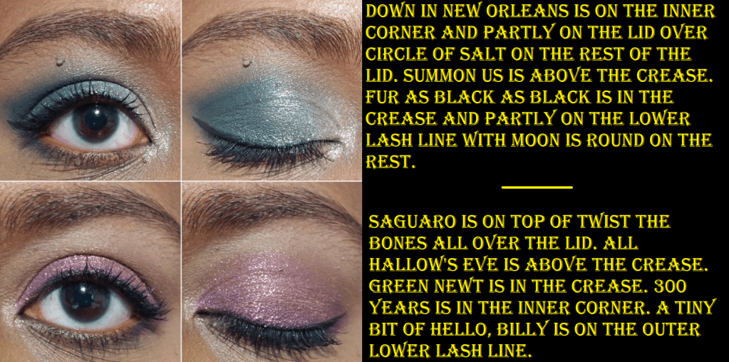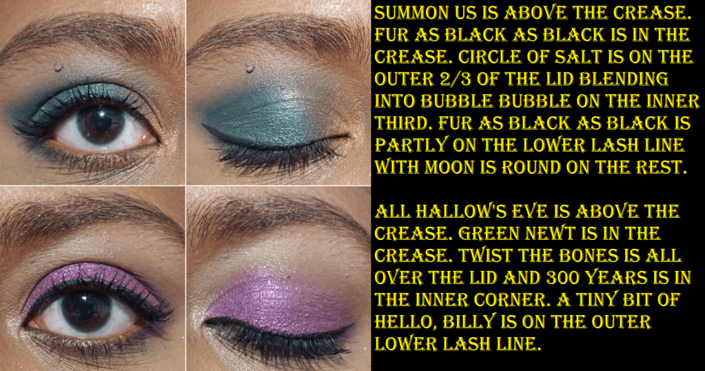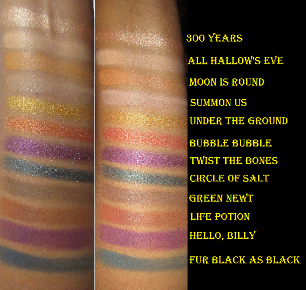 Halloween is my favorite holiday, so I grew up watching and loving Hocus Pocus. I didn’t get anything from the first collection between the IP and Colourpop, but this palette had such a “me” color story that I had to buy it. I’ve complained about this aspect before, so I won’t harp on it, but I still need to point out the matte and shimmer counterpart thing as well as the similarity of Summon Us and All Hallow’s Eve on my skin tone.