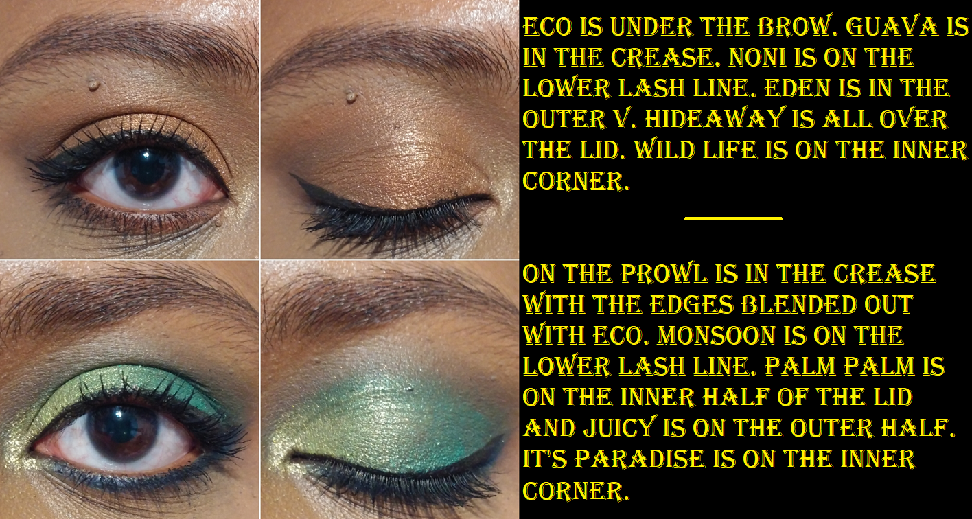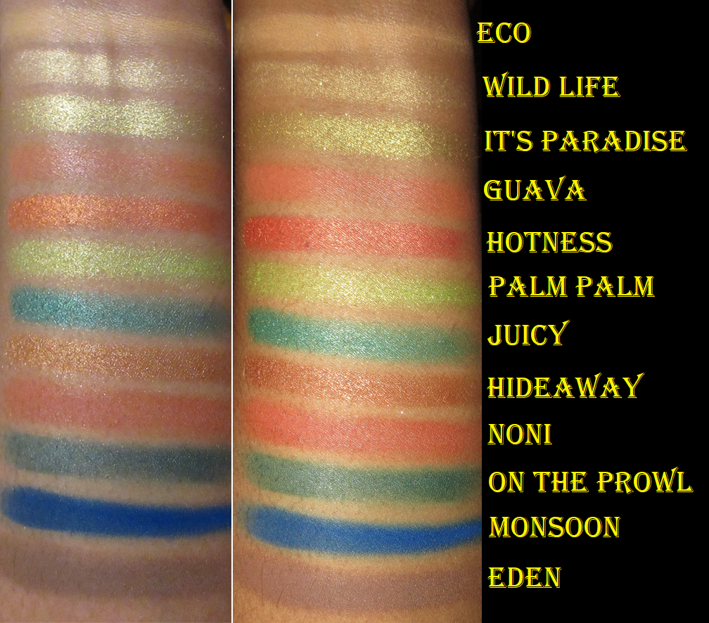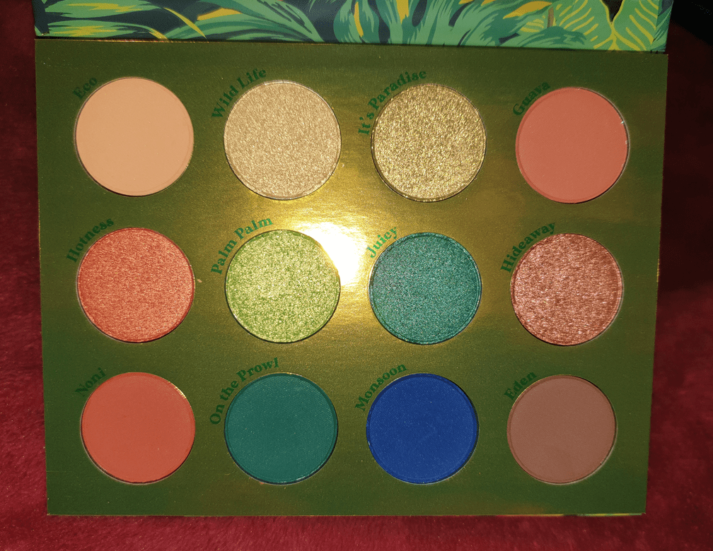 It’s Paradise and Palm Palm are similar. This palette also has several matching matte and shimmer counterparts (On the Prowl and Juicy, Noni and Hotness, as well as Eco and Wild Life), which sometimes I can appreciate. In this instance, I find it limiting, but I plan on depotting some of these shades to create a custom palette anyway.