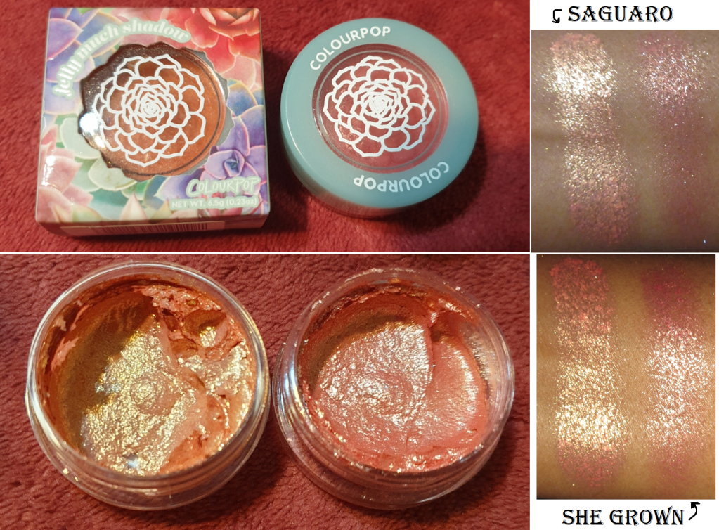 I could still rub the surface of these shades. I was surprised to see that She Grown, the shade I’ve shown before in one of my last Colourpop reviews, swatched more smoothly than Saguaro even though it’s four months older than Saguaro and had been opened and reopened several times.