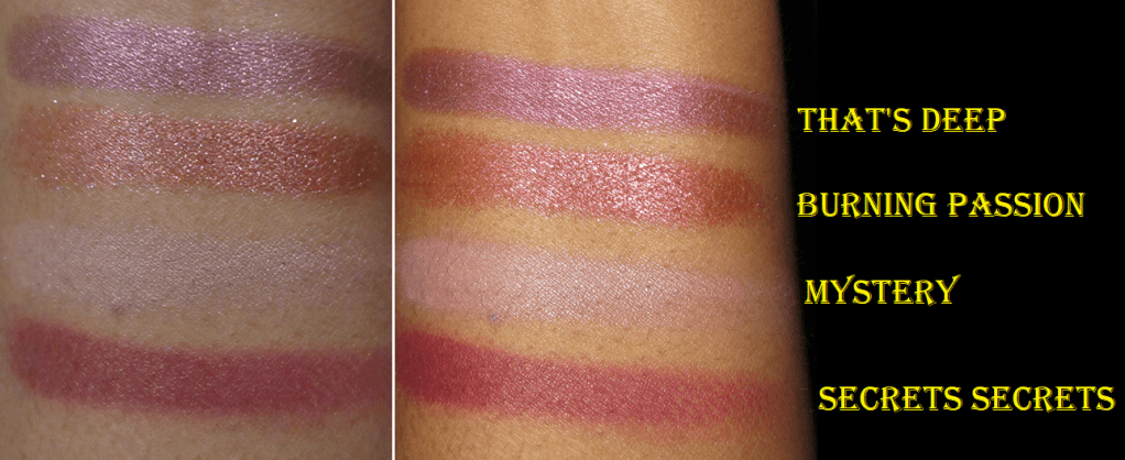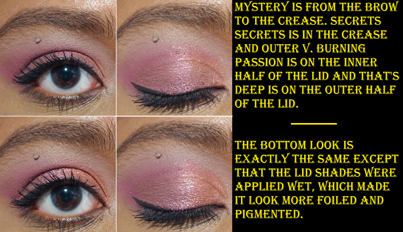 Before I knew this, I had already purchased the Scorpio quad because I knew the quality was going to at least be decent. This was also the first time anything Scorpio related (my astrological sign) had a color story I liked, as well as being the prettiest of the twelve released! Secrets Secrets is one of Colourpop’s most repeated type of reddish purple/burgundy colors they like to do, and the performance is always the same: very pigmented but slightly patchy. I always find this kind of shade appealing though. The shimmers are quite beautiful, but soft. They need to be applied wet or on glitter glue in order to make an impact.
