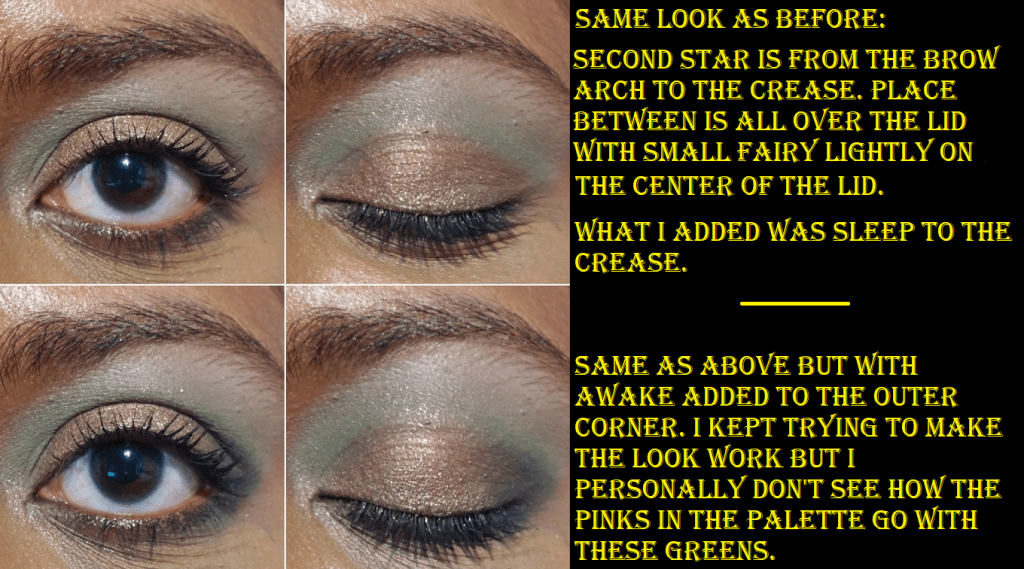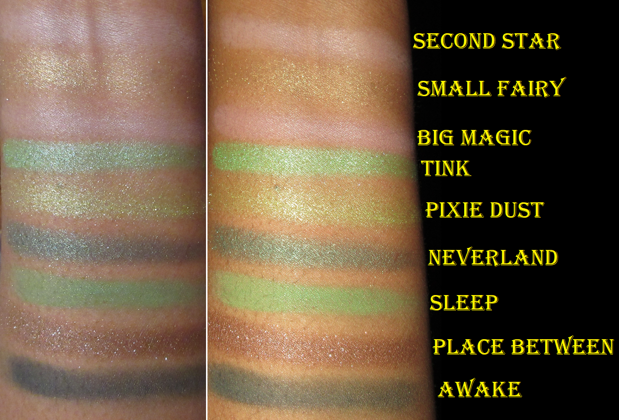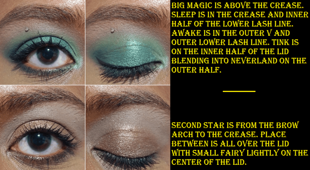 The upside to this palette is the really great quality. I had no issues blending the mattes. The shadows are pigmented. The shimmers are opaque and easy to apply. Place Between is sparkly and gorgeous on the lids. Neverland is this deep green-blue that I tend to like. The palette packaging is very cute, though I wish it didn’t have actual glitter on it. It’s the gritty kind that you can feel is raised when handling the palette, and the kind that will start sprinkling a few glitter particles here and there as time goes on.