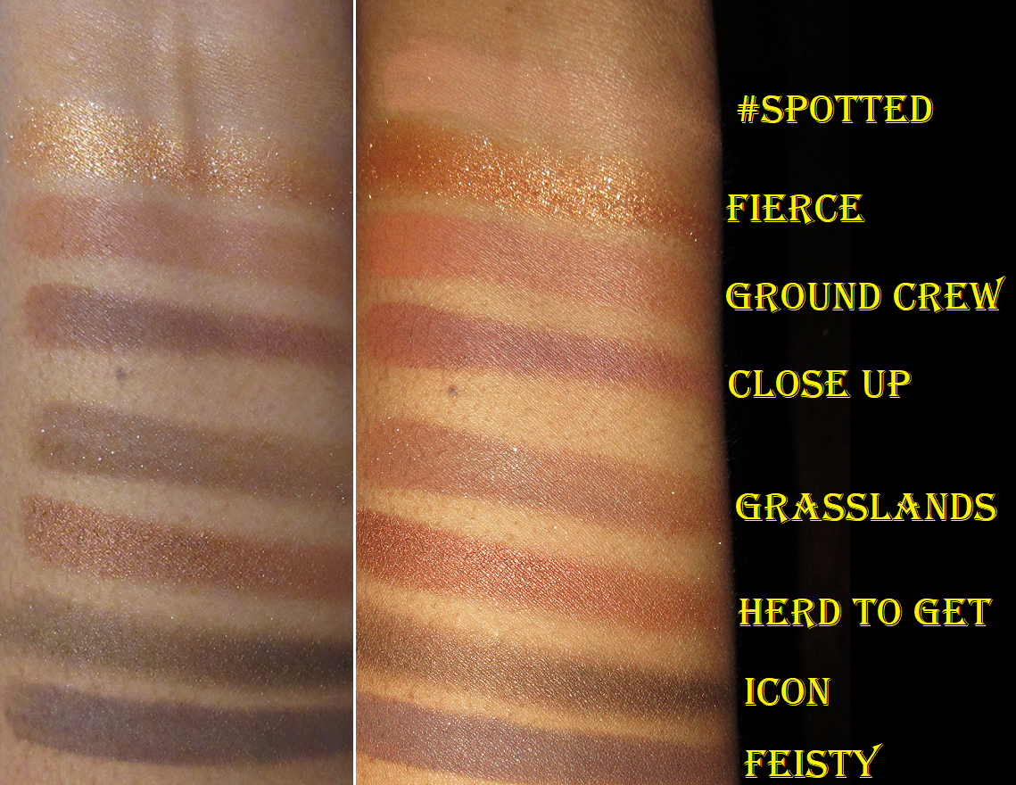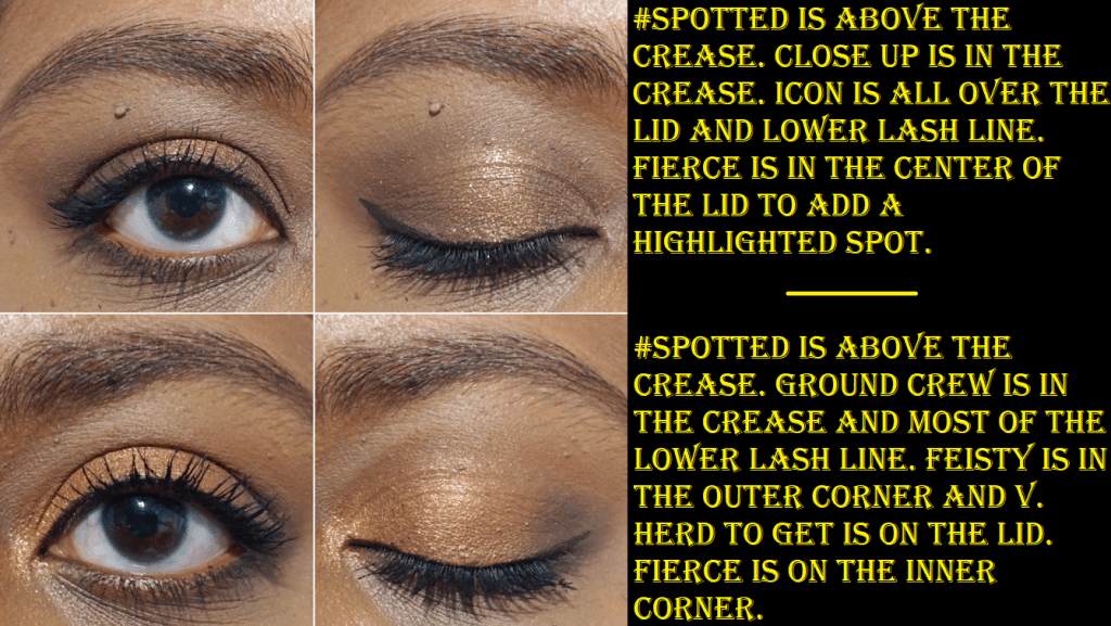 The thought of getting rid of 2 out of 9 shades would normally make me question my decision to buy the palette, but the fact that I love all the other shades is why I don’t have regrets. If I’m reaching for a neutral shadow, I like a deep shimmery chocolate brown like Icon. I can build up enough depth to my liking with Feisty. Ground Crew makes for a nice transition shade and Close Up looks great in the crease. Herd to Get isn’t really my preference for the lid, but I do think it looks nice on me and it makes sense to have a shade like this in this palette. #Spotted I use for blending edges if needed since it doesn’t really show on me. Just like Herd to Get, I wouldn’t want to put Fierce all over my lids, but it’s a beautiful highlighting shade for the inner corner and center of the lid.