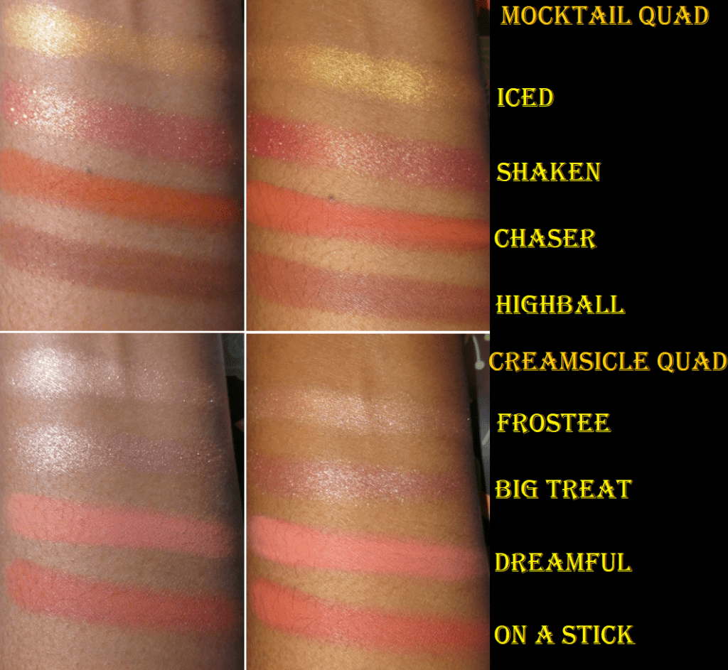 EYE SAFETY WARNINGS: For Creamsicle, Big Treat has PET glitter while On a Stick, I’m guessing, is dye/staining warnings. For Mocktail, Shaken has PET glitter. For Scorpio, Secrets Secrets might also have the warning for dye/staining. I should have been more careful and checked for PET before purchasing since I don’t like to use polyethylene terephthalate, even if it’s not in a pressed glitter formula. I am sad to say I will be decluttering Creamsicle and Mocktail from my collection since the pans in the quads are not removeable/replaceable. Plus, Iced from the Mocktail quad fell out of the pan on me already. I was able to press it back in, but I don’t want to have to worry about that happening again in the future.