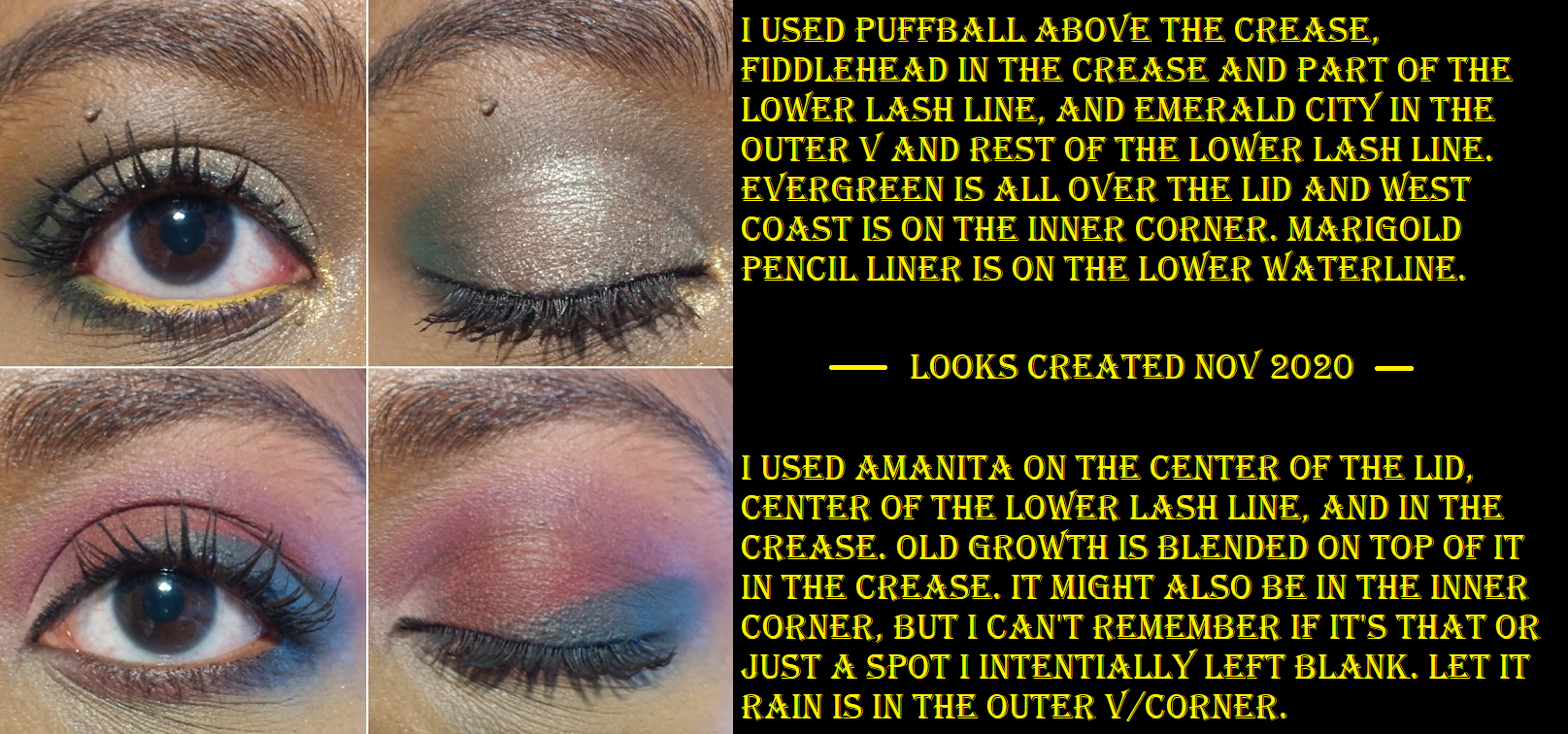 Spare Thyme sold out in my cart during the initial RBK launch. I was able to snag Marigold. I don’t have many colorful liners, and something about Colourpop ones (perhaps how matte and dry looking they can be) don’t look great on my waterline unless I border them with an additional black liner as a frame between the color line and my lower lashes (for example the first look in the At Forest Sight section). The fact that it took three or four restocks before I could successfully buy Spare Thyme before it sold out is why I ignored this fact with Marigold and decided that somehow Spare Thyme would work better. In this case, it actually does look better, but it’s more to do with it being a darker color. All the previous Colourpop liners I used were light shades. Because of my personal preferences, I can’t be objective in saying whether they are worth purchasing or not.