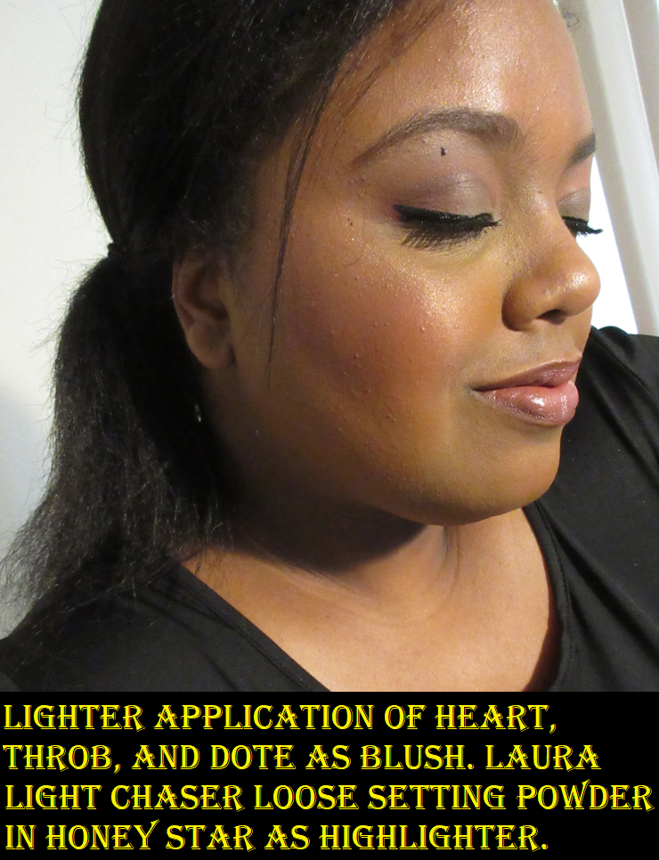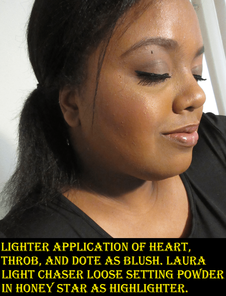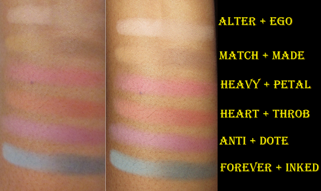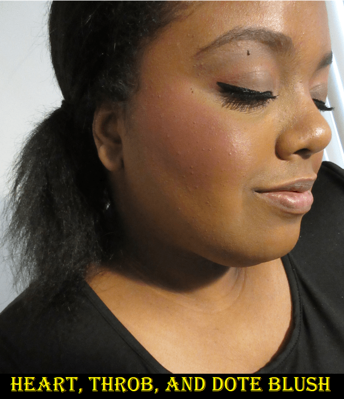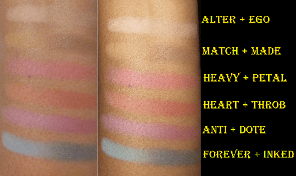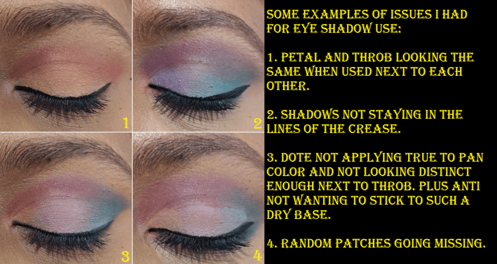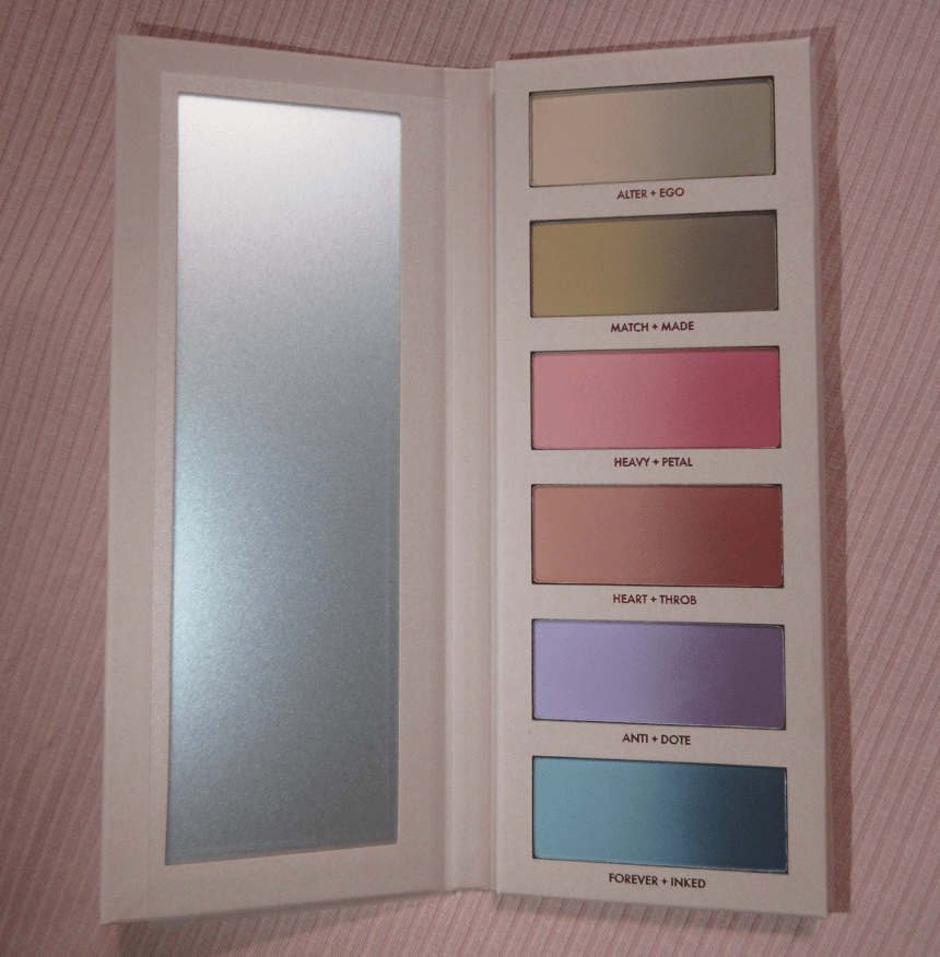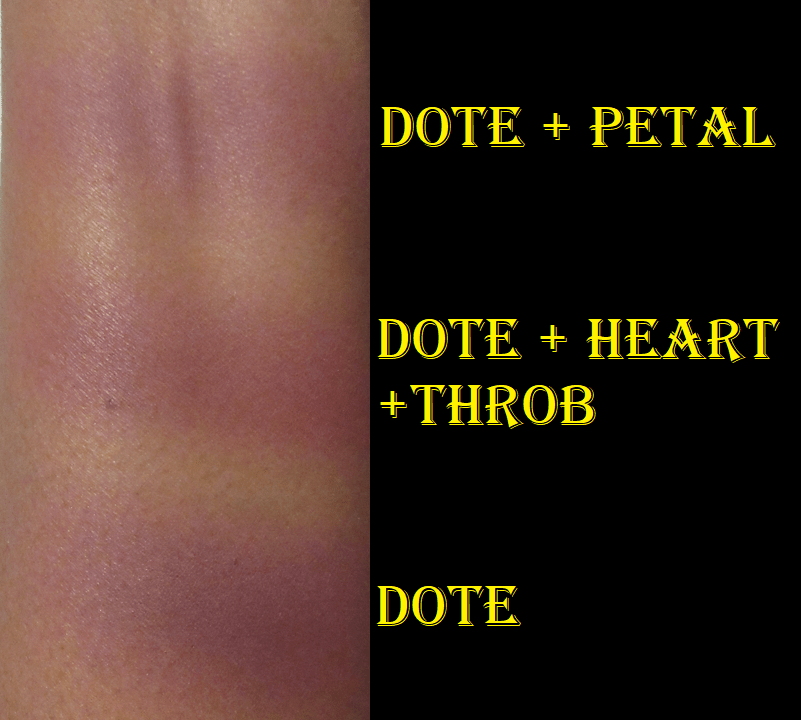 This is the main use I have for this palette. Petal and Throb are easily my favorites. I was surprised to see that Heavy still shows on my skin and doesn’t look ashy in my eyes. Heart is quite subtle but also pretty. I was the most curious to see how I could incorporate Anti, Dote, or some combination of those two with the other shades in order to create a slightly purple blush tone and even a mauve. Sometimes I’m successful at being able to pull off using a mix with the purple, but overall, I find that Dote is not easy to blend. In my experience, pigments using Manganese violet are difficult to formulate so that it blends well and smoothly on the skin. Dote has a tendency to stick in spots and look muddy when mixed with the other shades. It’s still prone to patchiness even when used alone. It’s a bit of a shame because it can look pretty sometimes, but it’s not a deal breaker regarding versatility of blush usage since I wouldn’t rock a purple cheek regularly anyway.