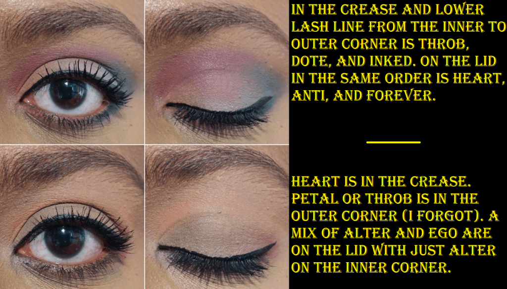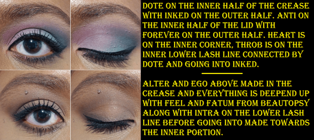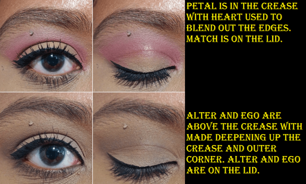 Shade-wise, I can use a mixture of Alter plus the middle spot between Match and Made to set my under eye concealer, but the effects don’t last as long or look as nice as a more traditional setting powder. This is quite the difference considering I get an almost blurred effect when I use Beautopsy’s Tan, Feel, and Paint for that purpose. I don’t have a natural brow shade in this, which I wouldn’t expect considering I only use dark-brown or nearly black shades for my brows. As for eyeliner, Made barely gives me enough depth to deepen the outer corner of my eyes so it would make for a poor eyeliner. My realistic liner options are Petal, Throb, Dote, and Inked.