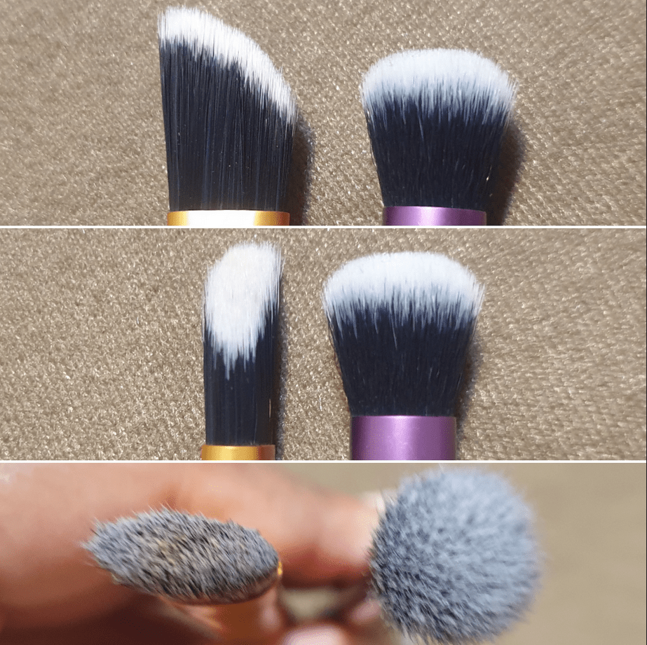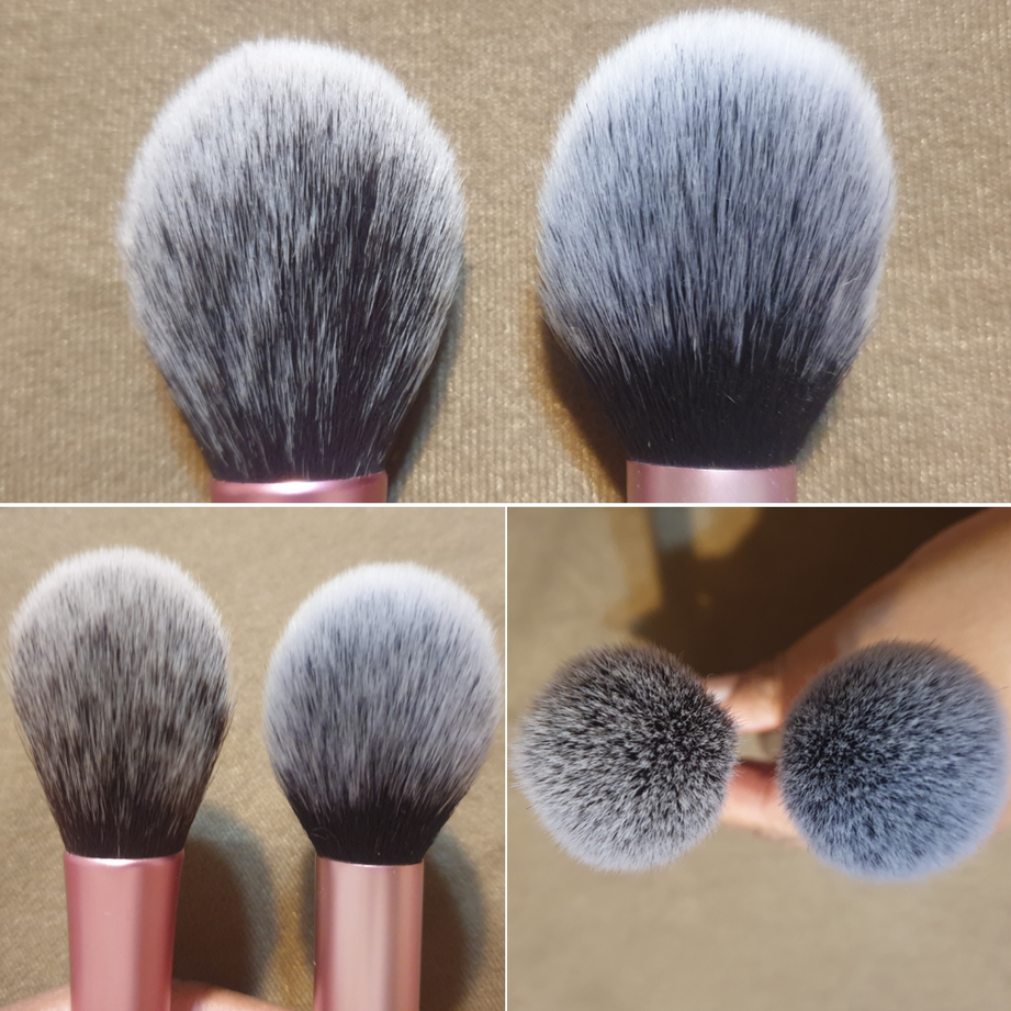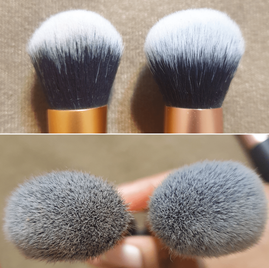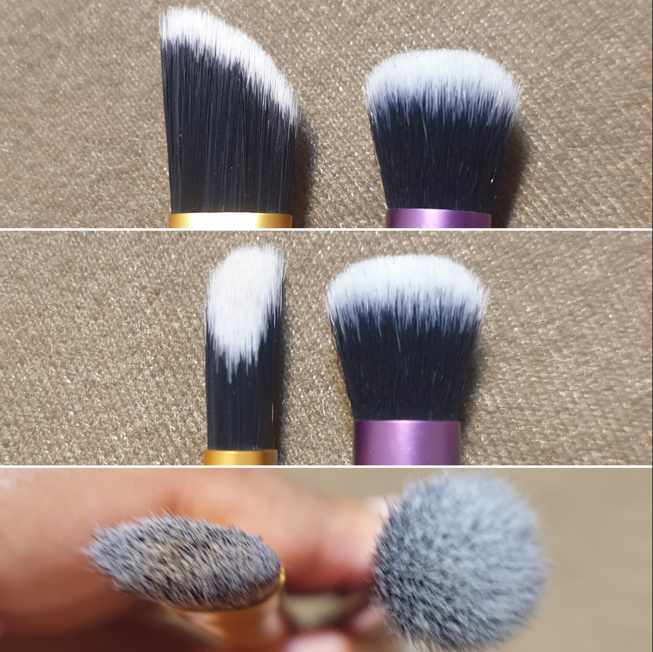 The original brush has wavier bristles and is narrower than the new version of the blush brush. I expected to find major differences in the performances of these brushes, but the end result of each brush looks exactly the same. The only difference is the new one is softer, so the new blush brush also wins.