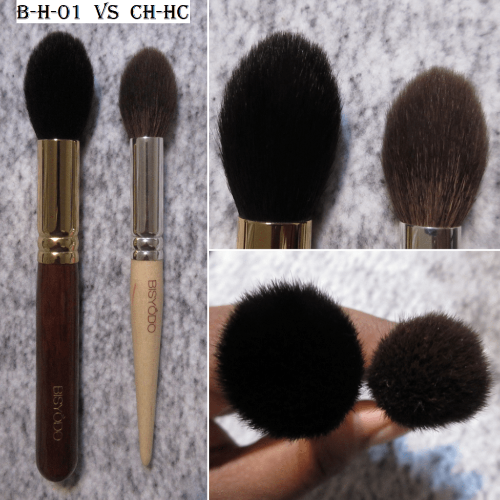 Since the Bisyodo CH-HC is one of my holy grail highlighter brushes, I wanted to purchase the similar looking B-H-01 as my premium version. The head size and handle weight differences give it a much different feel than I expected and the end result is not alike at all. Since the B-H-01 ends at a wider taper than the CH-HC, the former gives a more diffused look whereas the latter is better for precision and a little more concentration of product.